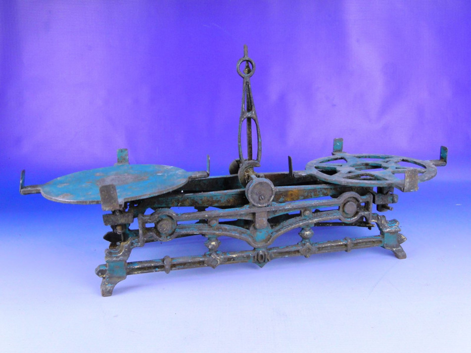 Antik öntöttvas nagyméretű 10 kilós kétkarú konyha vagy piac mérleg.