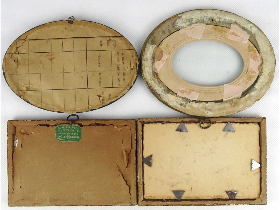 Régi, szép állapotú, vegyes, kis méretű képkeret fotó keret csomag, 4 darab. Két egyforma szögletes aranyozott fakeret és két különböző ovális keret, egy fekete fa és egy aranyozott fém keret.