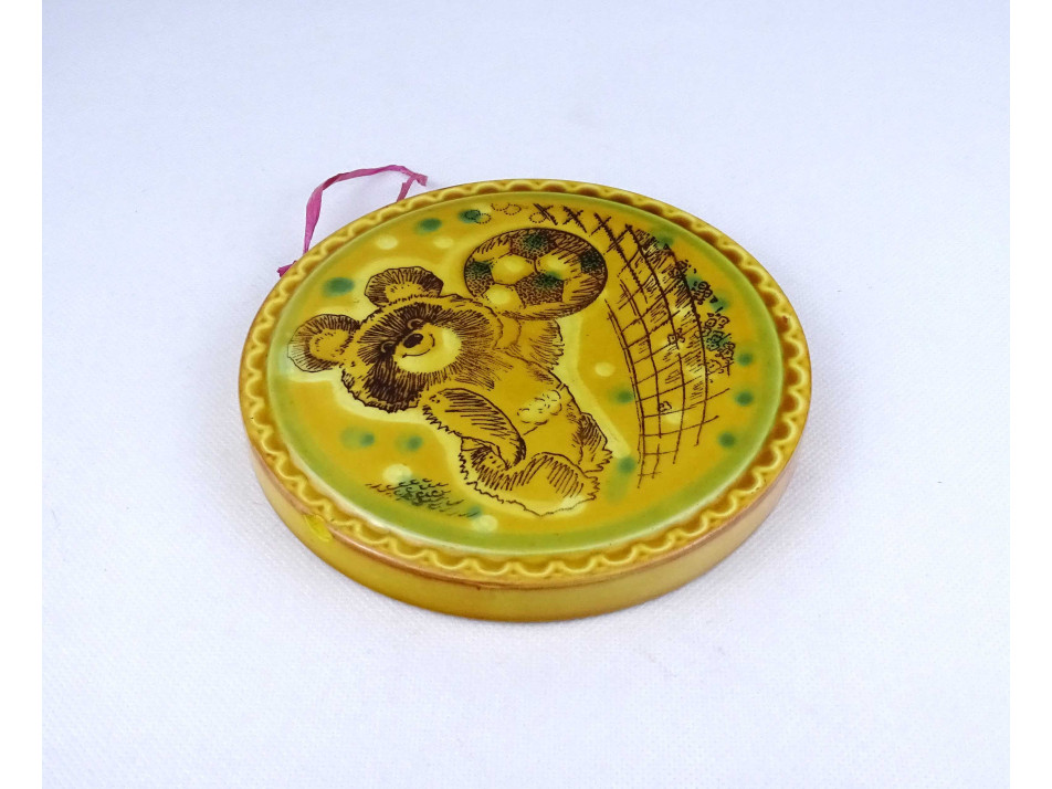 Retró, szép állapotú, Misa Mackót, az 1980-as moszkvai olimpia kabalafiguráját focilabdával ábrázoló kerámia falikép, falidísz. A plakett oldalán egy apró lepattanás látható.