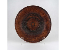 Régi szép állapotú karcagi fekete cserép tányér, falitányér, három darab. Az egyik kis méretű tányér akasztója sérült, hátoldala ragasztós.
