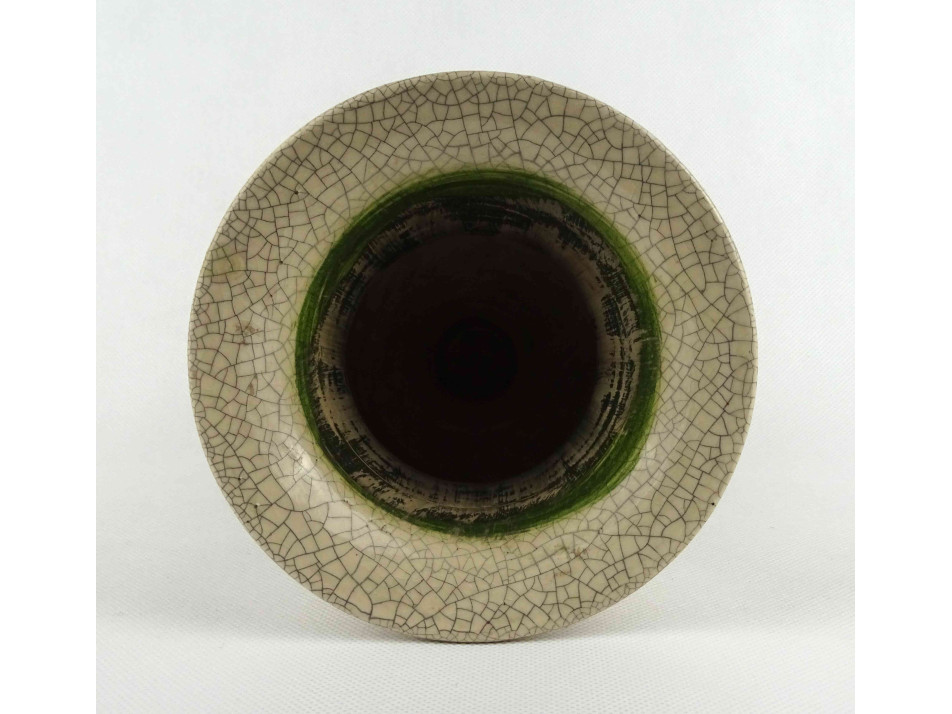 Retro, hibátlan állapotú, részben mázas, zöld és drapp színű, jelzetlen talpas kerámia urnaváza, díszváza.