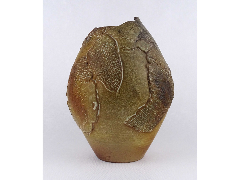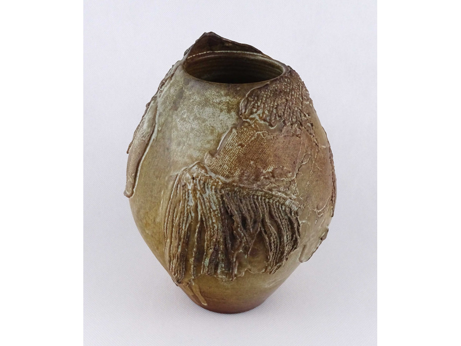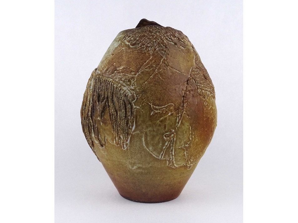 Hibátlan állapotú, barna színű mázas aplikációs technikával készült, plasztikus textílszövet mintázatokkal díszített G. Heller Zsuzsa kerámia váza. Iparművészeti kerámia.