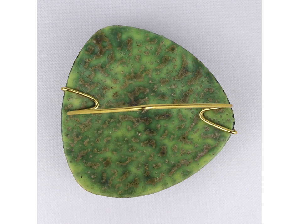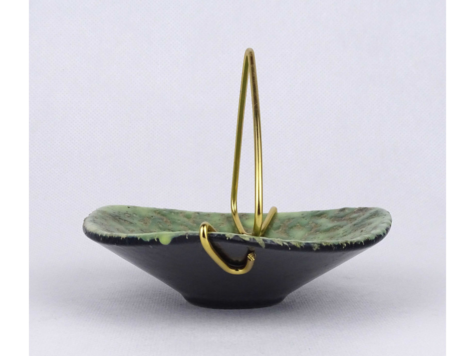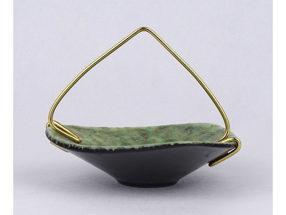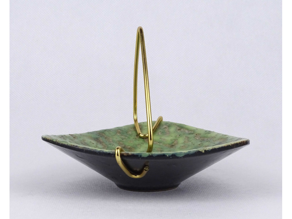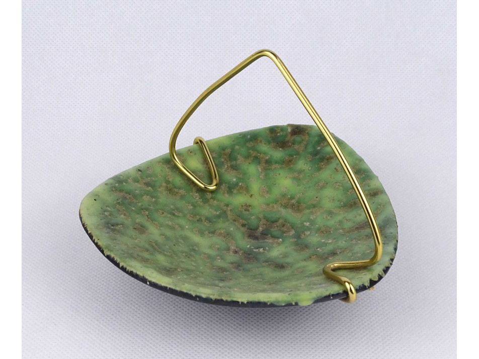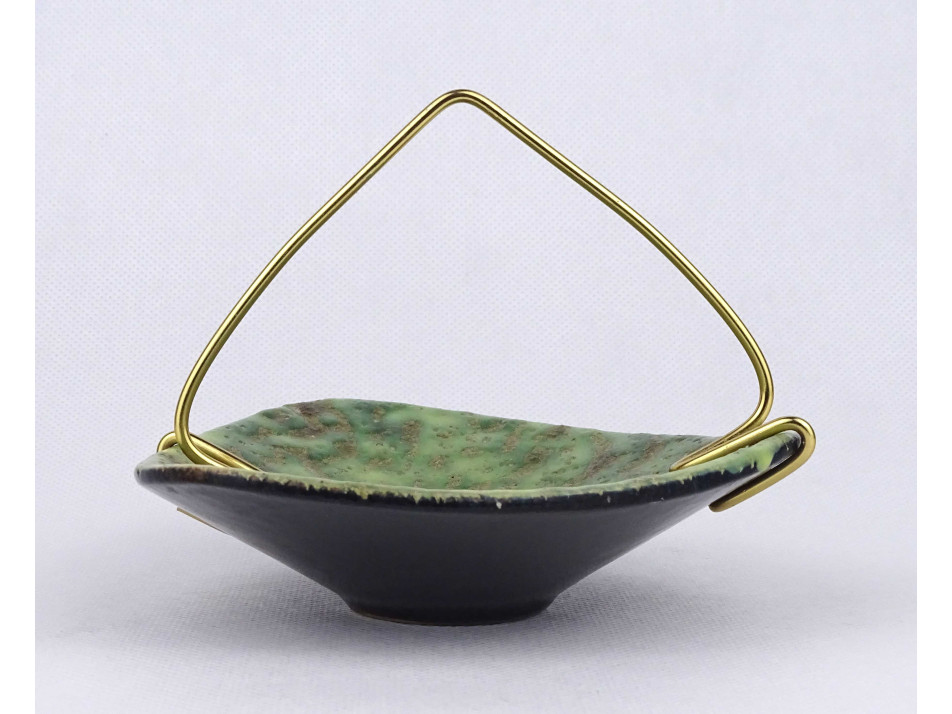 Retro háromszög alakú, réz fogantyús, zöld mázas kerámia tálka, kis tál
