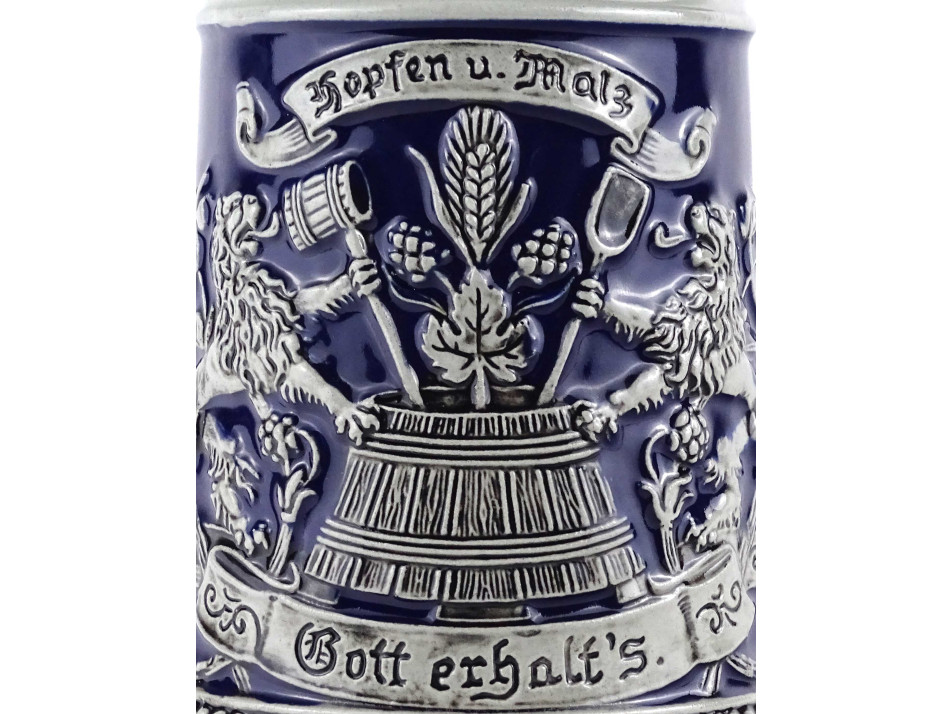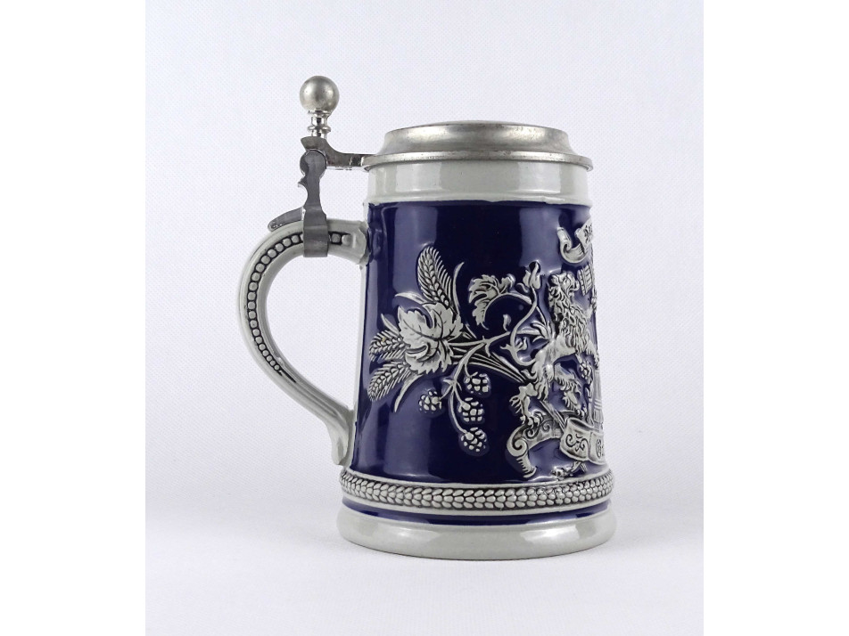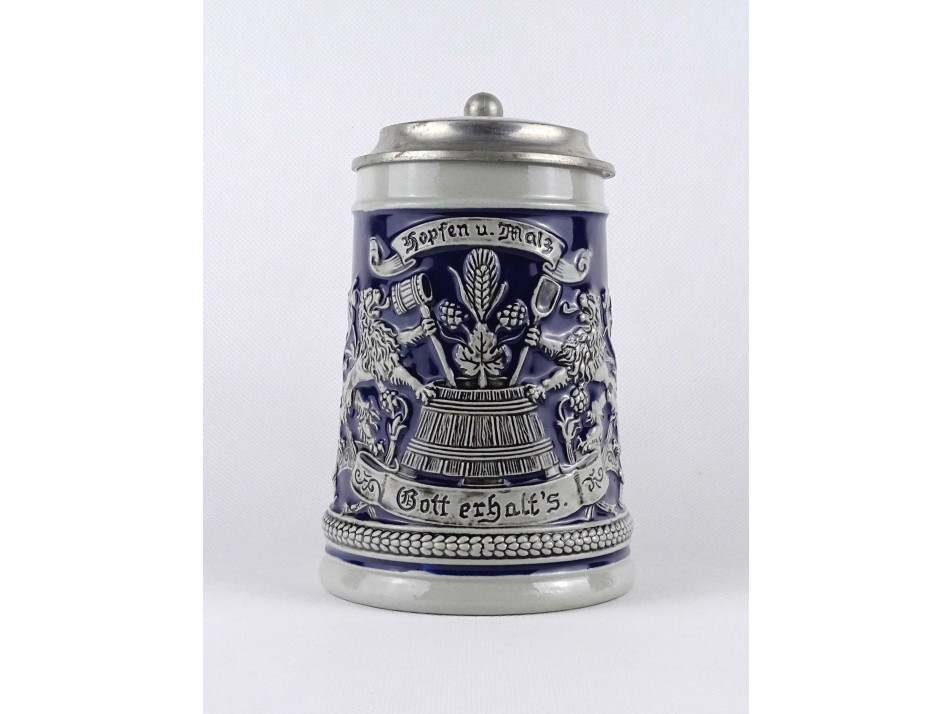 Hibátlan állapotú, ónfedeles jelzett kerámia söröskorsó, rajta oroszlános domború díszítések, kék festett alapon.