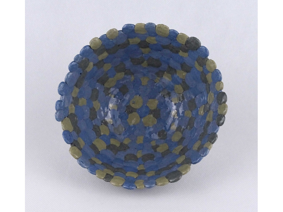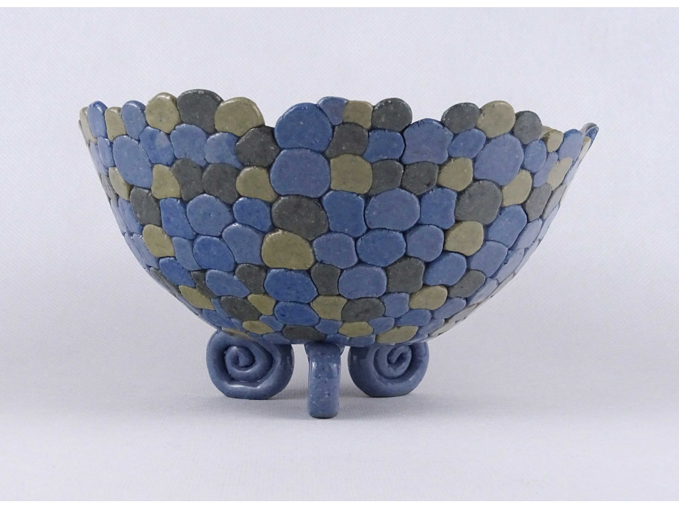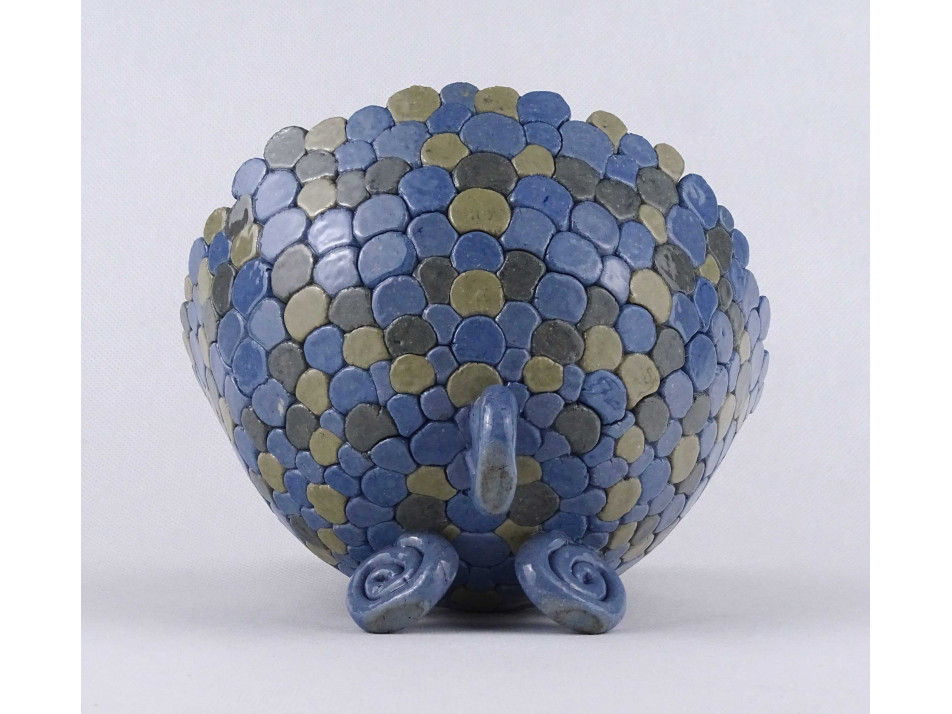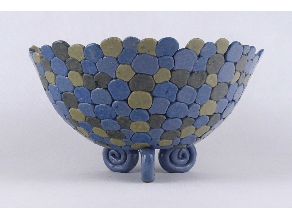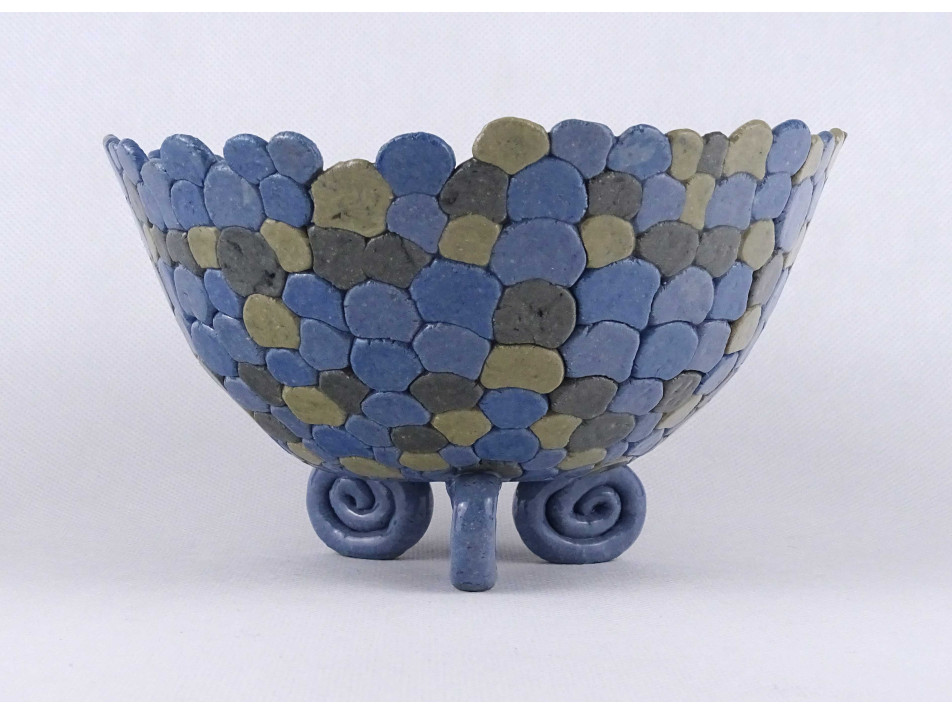 Jelzetlen, három csiga lábon álló, különleges különbözö színű gömbökből összeállított kerámia asztalközép, kínáló tál, gyümölcskínáló.