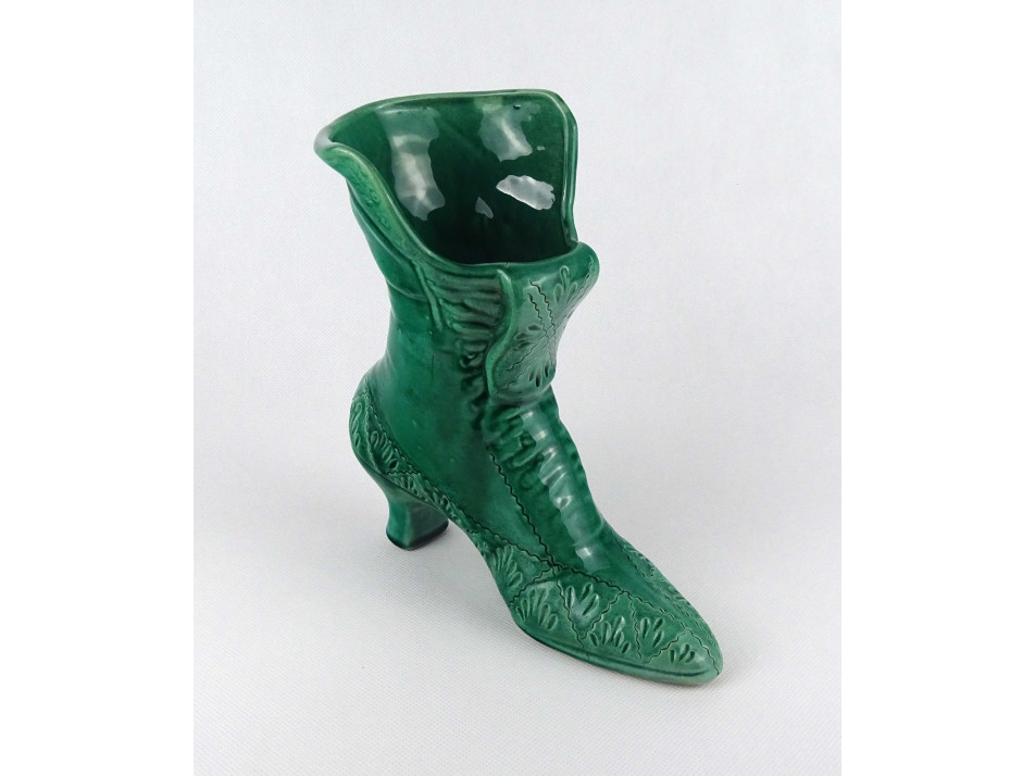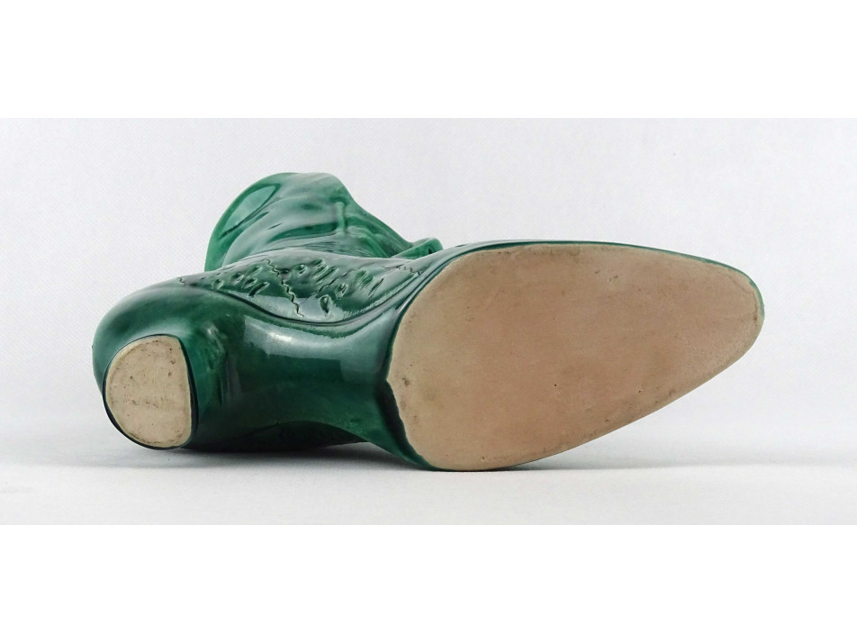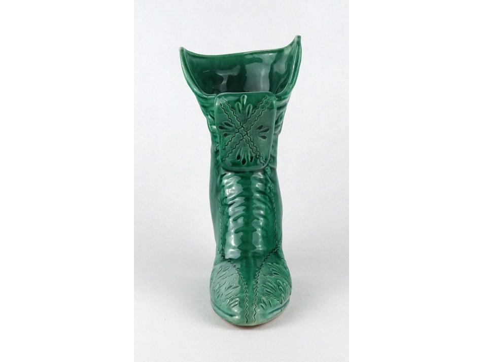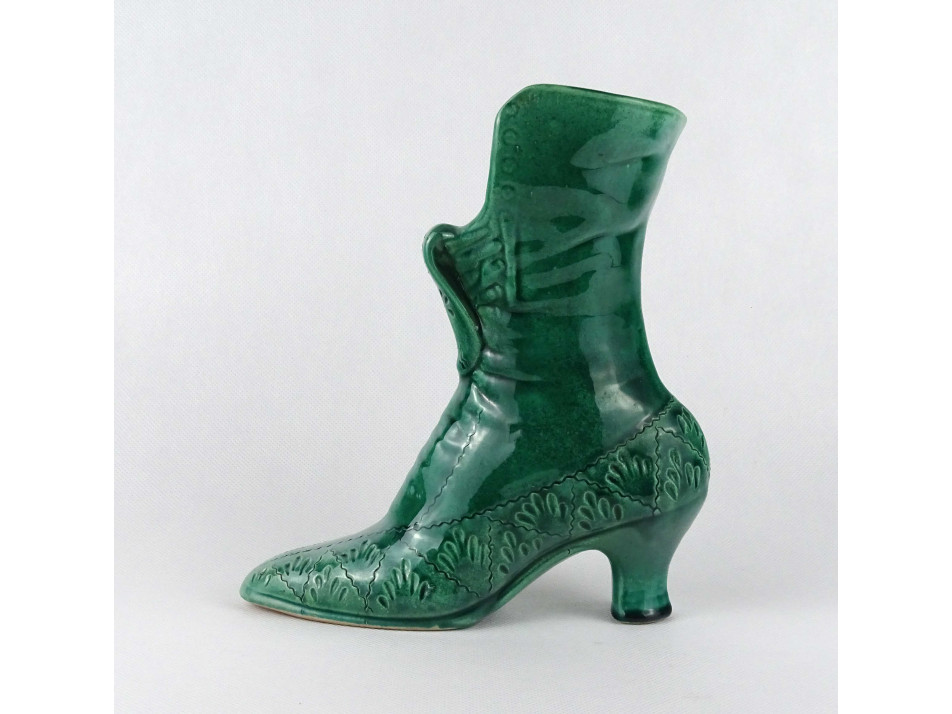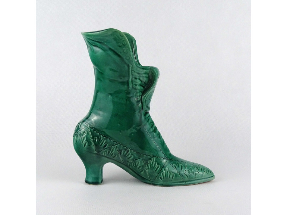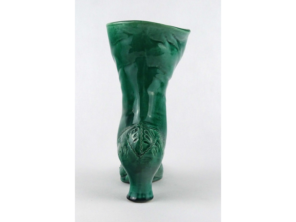 Hibátlan állapotú, jelzetlen, női magassarkú, csizma alakú, zöld mázas kerámia váza, díszváza.