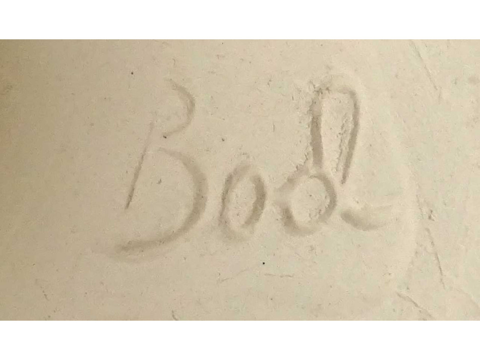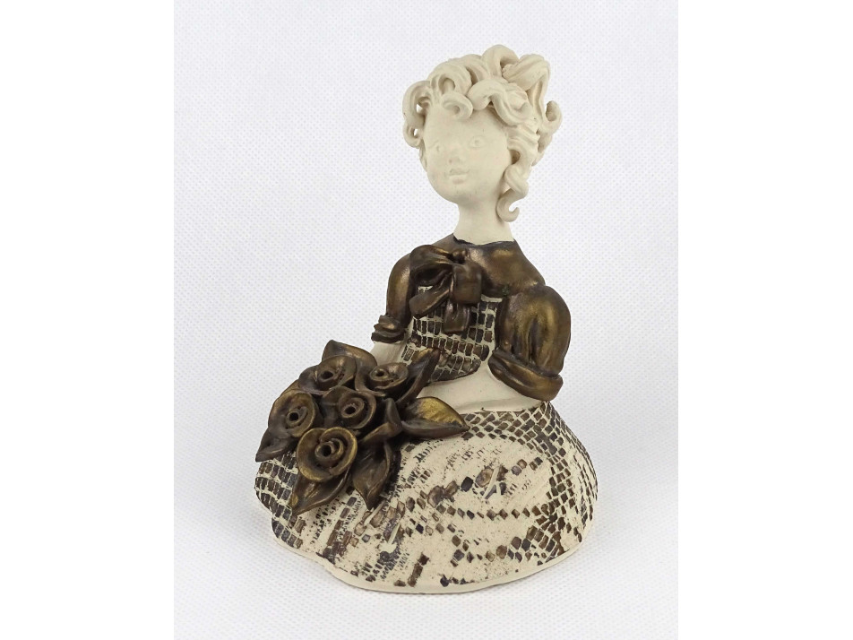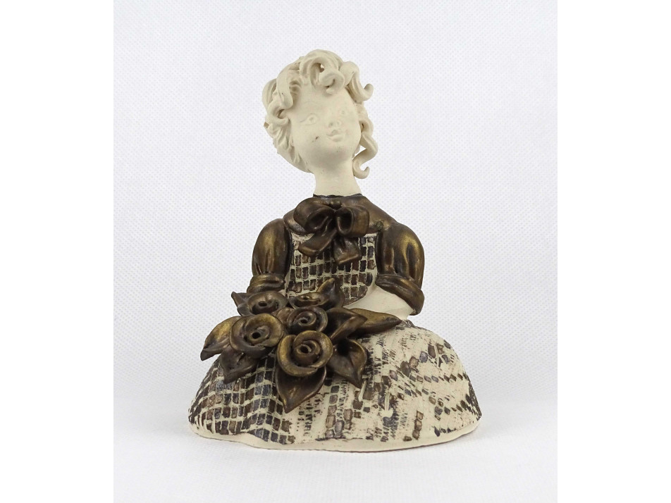 Hibátlan állapotú, részben bronz színű mázas, jelzett Bod Éva kerámia figura, ülő, csipkeszoknyás kislány. Belsejében karcolt jelzés: BOD