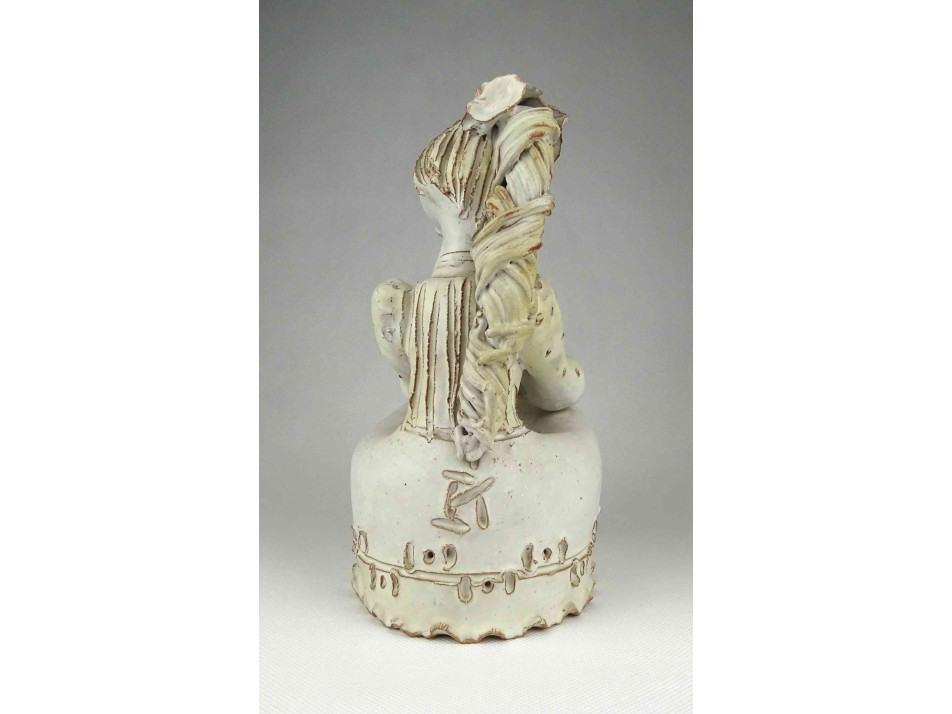 Hibátlan állapotú, jelzett nagy méretű fehér mázas ülő női kerámia figura, kezében virágcsokorral. Hátulján karcolt jelzés. lásd fotó. (Kovács Éva Orsolya)