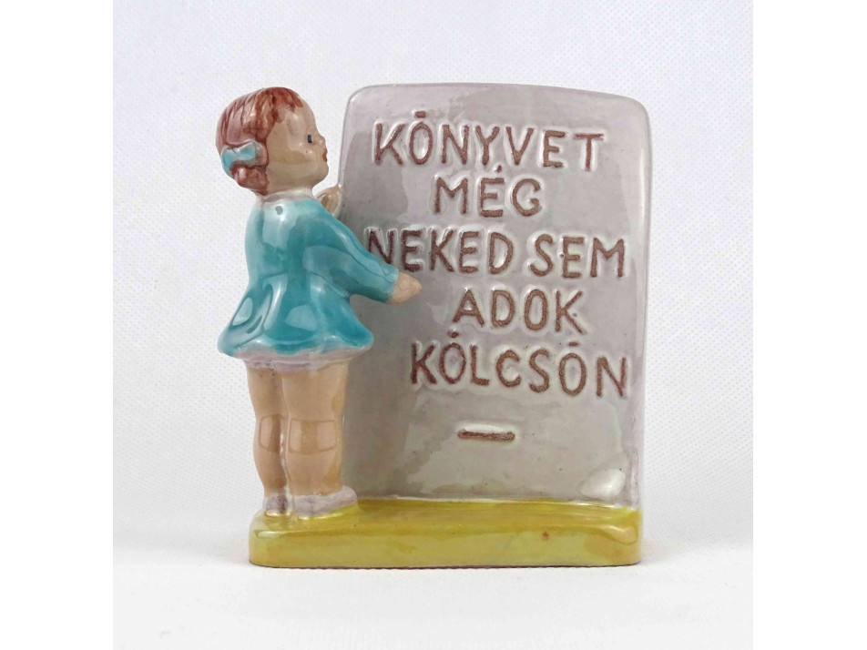 Hibátlan állapotú, talapzaton álló, feliratot tartó kerámia kislány figura. Felirat: KÖNYVET MÉG NEKED SEM ADOK KÖLCSÖN