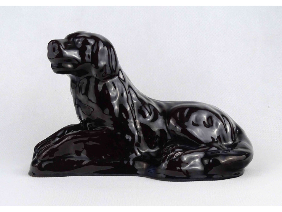 Nagyméretű, hibátlan állapotú, jelzetlen sötétbarna mázas kuvasz kutyát ábrázoló kerámia szobor, fekvő kutya szobor.