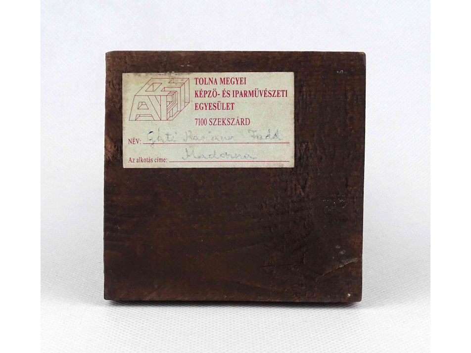 Hibátlan állapotú, kis méretű, máz nélküli, Gáti Mariann kerámia figura, fejkendős nőalak gyermekével. Madonna büszt, fa talapzaton.