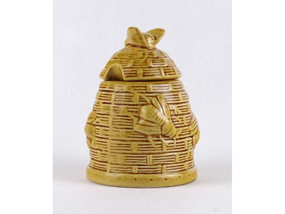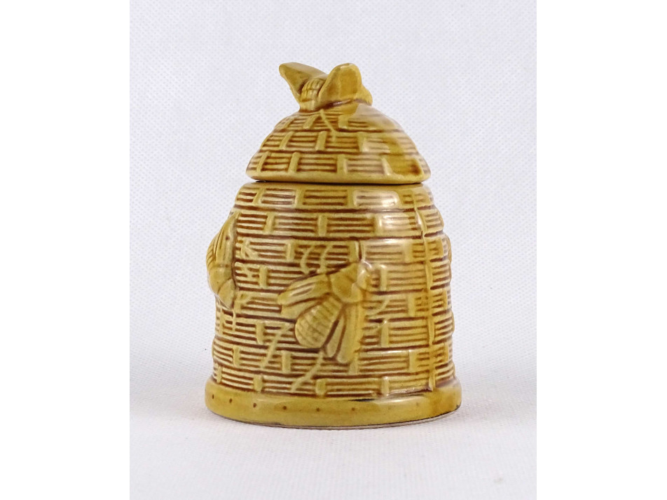 Régi, hibátlan állapotú, jelzetlen méhkaptárt mintázó fedeles kerámia mézes csupor. A csupor fedelén és oldalán plasztikusan kidomborodó méh figurák találhatóak.