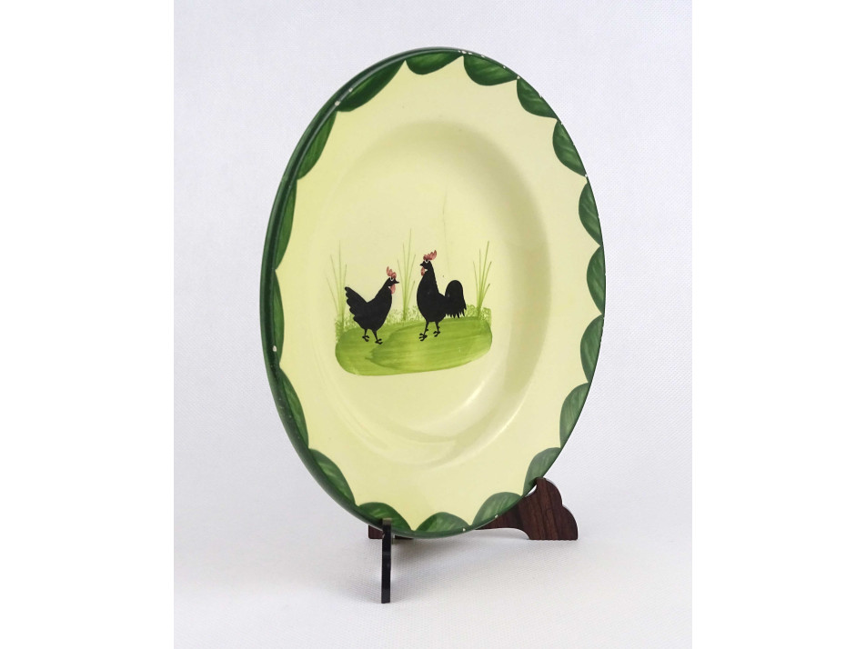 Szép állapotú, vajszínű, mázas, kakasos mintával díszített, német kerámia dísztányér. Peremén több apró lepattanás látható.