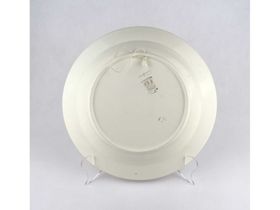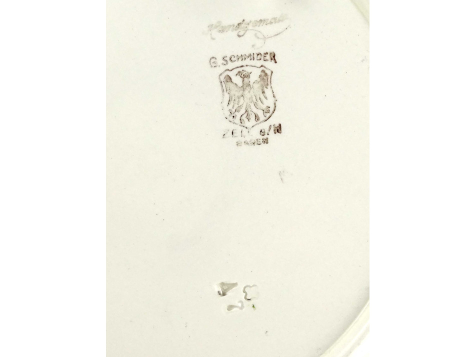 Régi, hibátlan állapotú, jelzett német Georg Schmider Zell kerámia tányér, dísztányér, fali tányér falra akasztási lehetőséggel. Rajta virágmintás díszítés és gótbetűs német felirat.