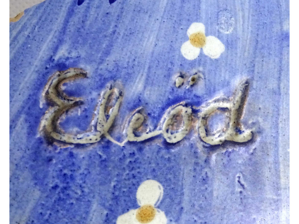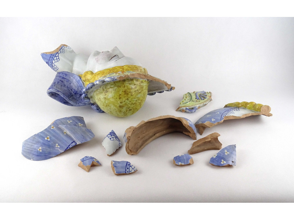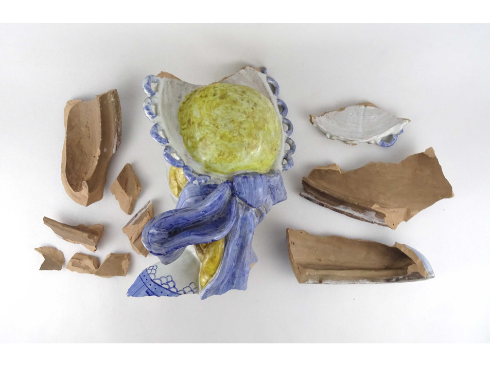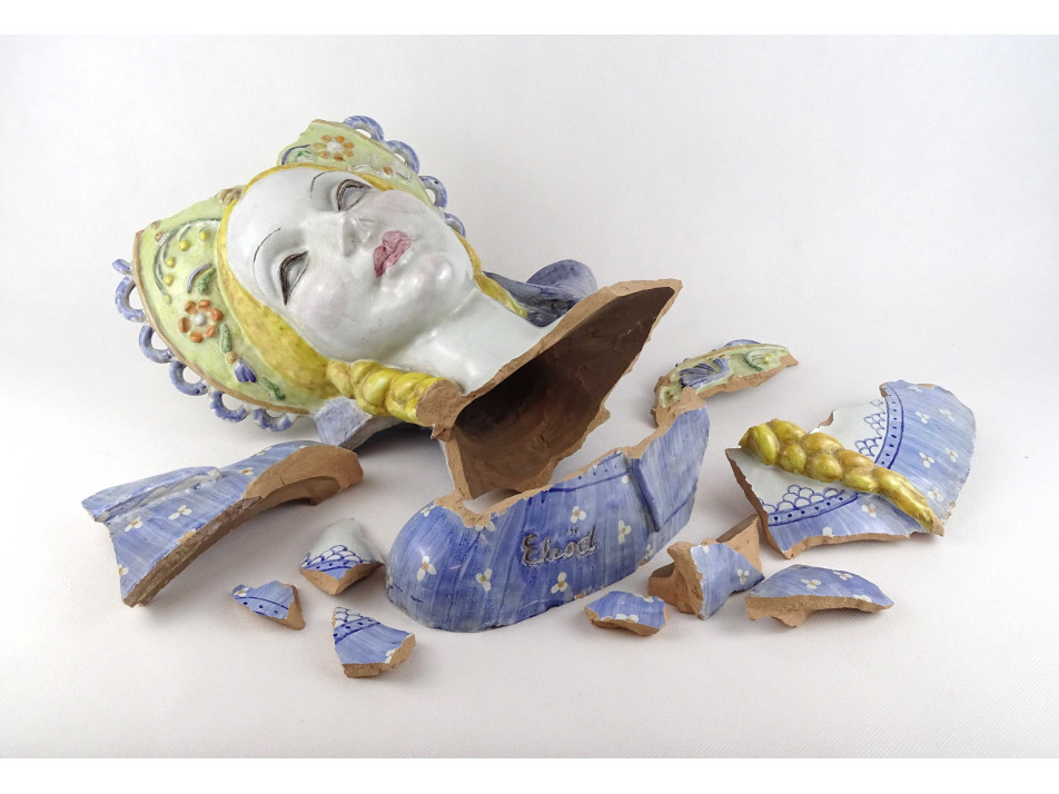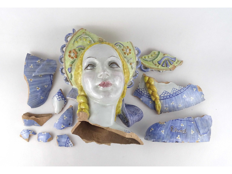Antik, nagyméretű, színes mázas, népviseletbe öltöztetett, jelzett Eleőd, art deco női büszt, kerámia női mellszobor, sérült, darabokra törött állapotban.
