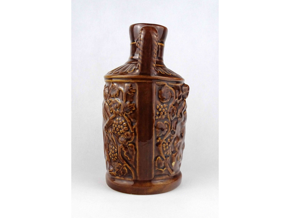 Hibátlan állapotú, barna színű mázas kerámia füles korsó, boros kancsó. Oldalán plasztikus szüreti jelenetekkel díszített.