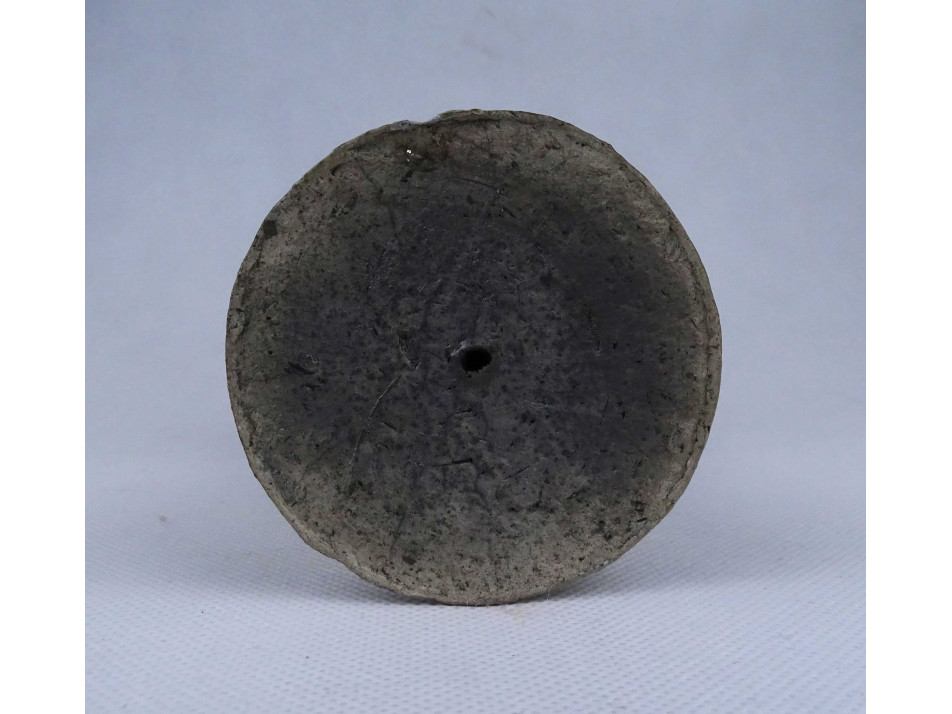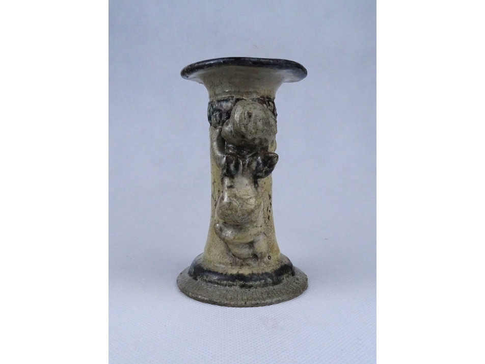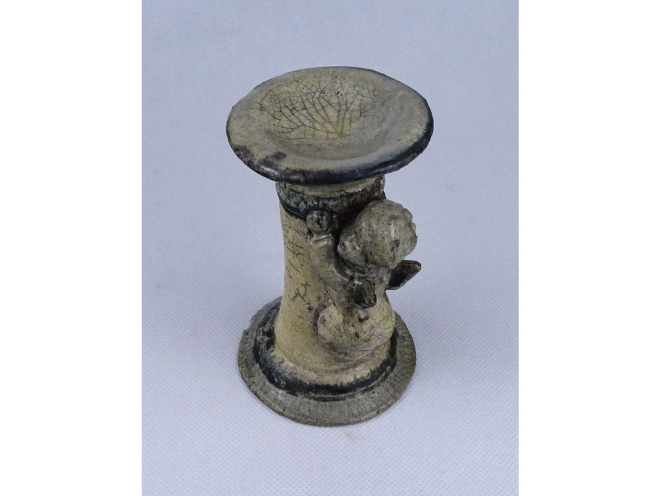 Szép állapotú, jelzetlen iparművészeti kerámia gyertyatartó, oldalán kapaszkodó plasztikus angyal figurával díszítve. Alsó peremén egy apró, alig észrevehető lepattanás látható.