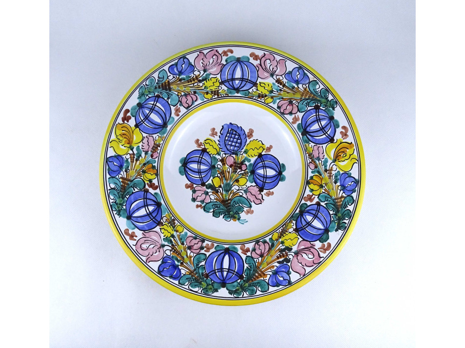 Régi, hibátlan állapotú, nagyméretű, jelzett, fehér mázas, virágdíszes, habán jellegű kerámia dísztányér, falitányér, Akasztási lehetőséggel.