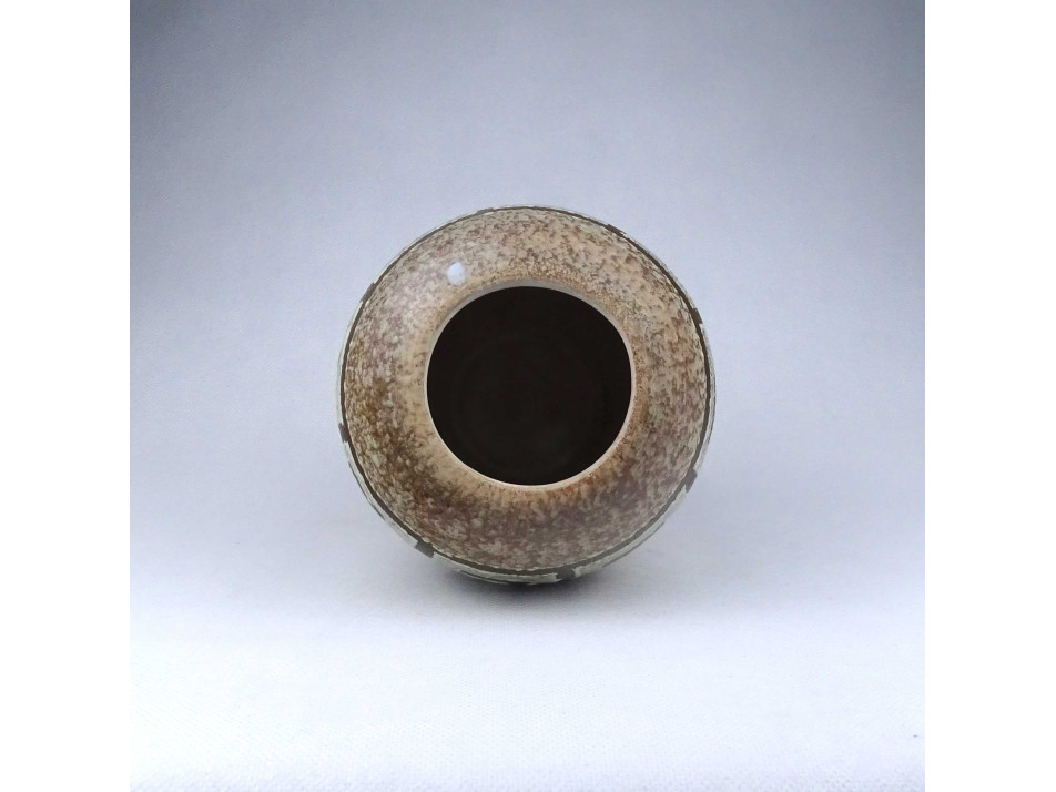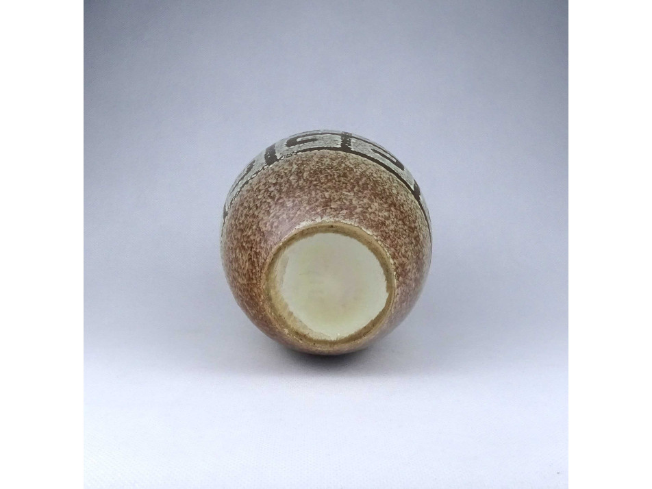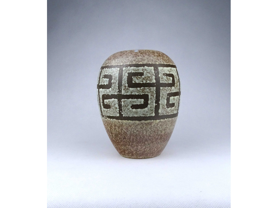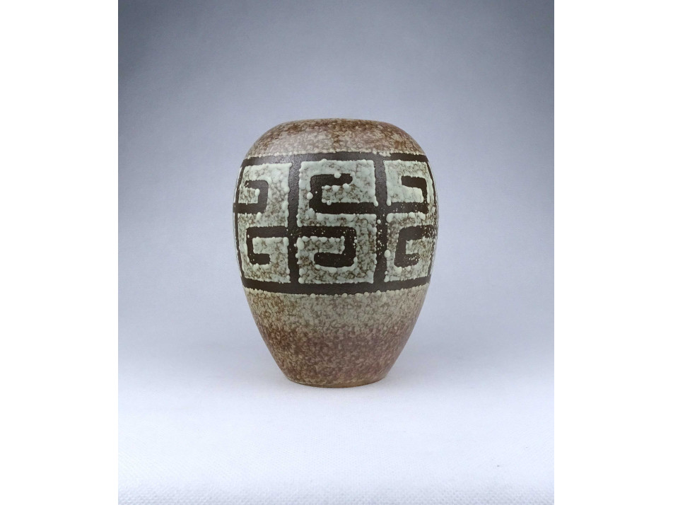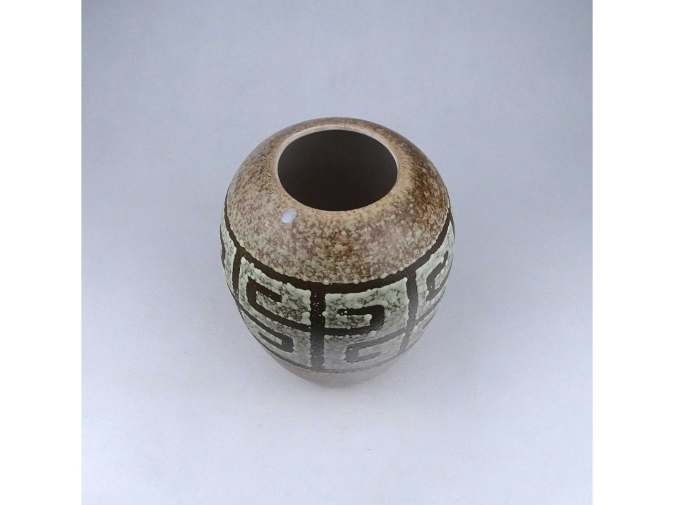 Retro, barna mázas, görög meander mintás, közepes méretű, öblös kerámia váza, díszváza.