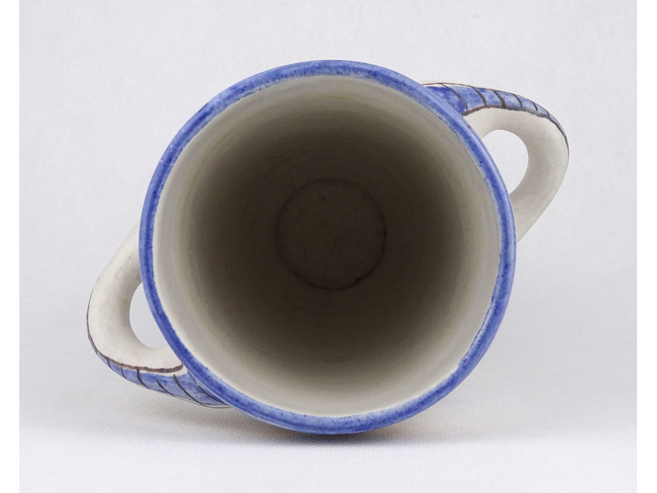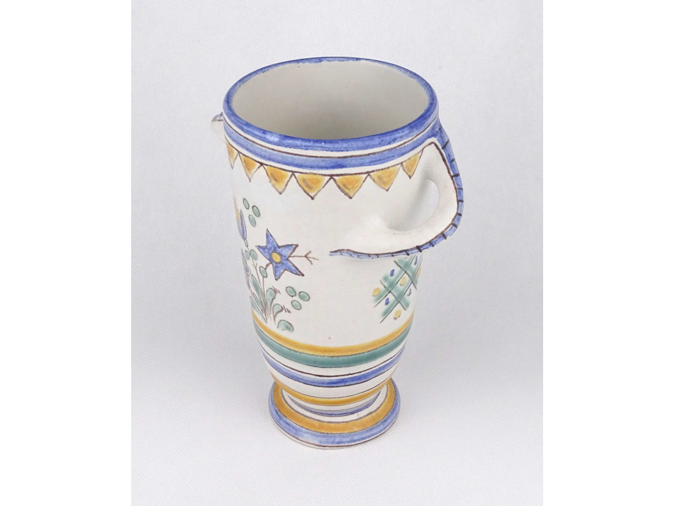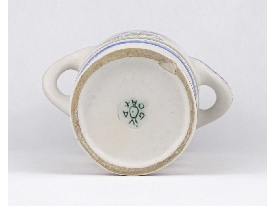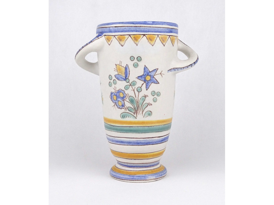 Szép állapotú, kétfülű, Iparművész Vállalatos Gorka kerámia váza, díszváza. Rajta habán jellegű kézi festett díszítések. Talpán egy apró lepattanás látható.