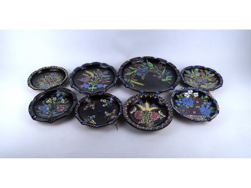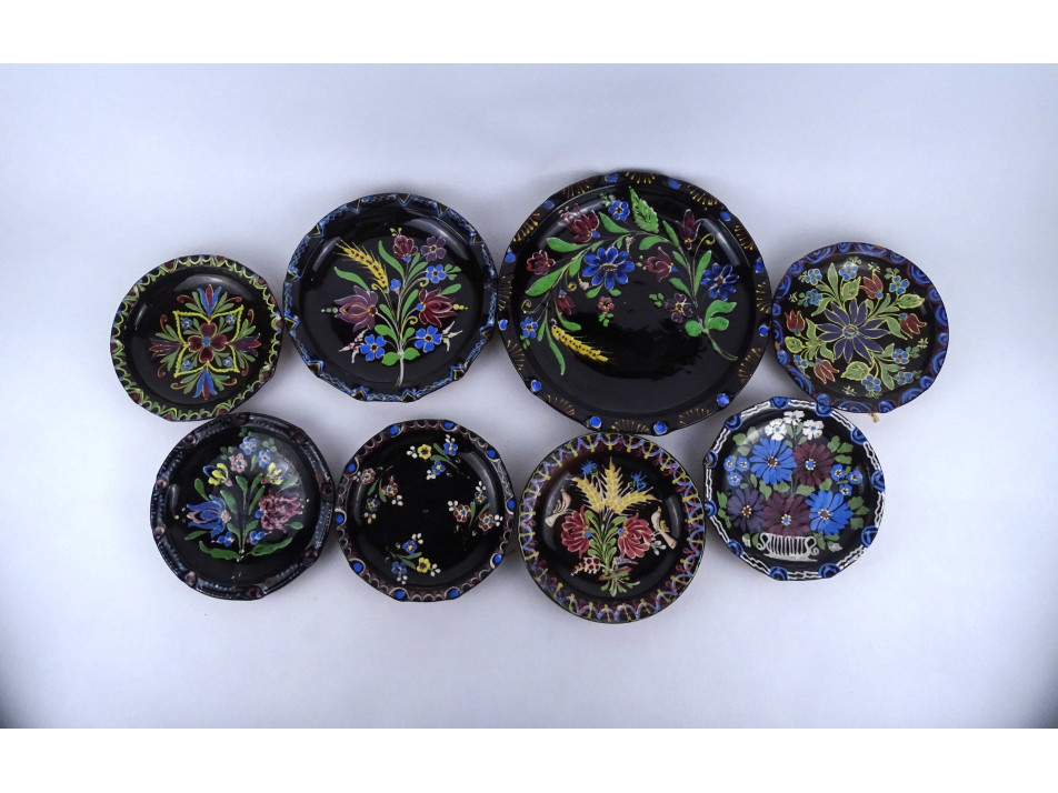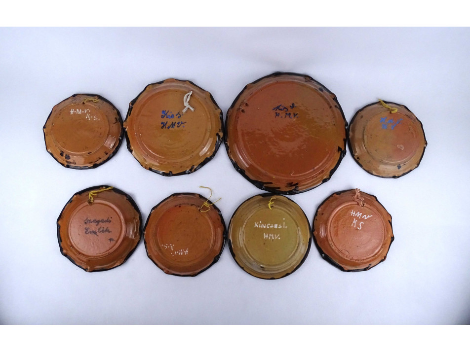 Régi barna mázas virágdíszes vásárhelyi kerámia falitányér készlet 8 darab