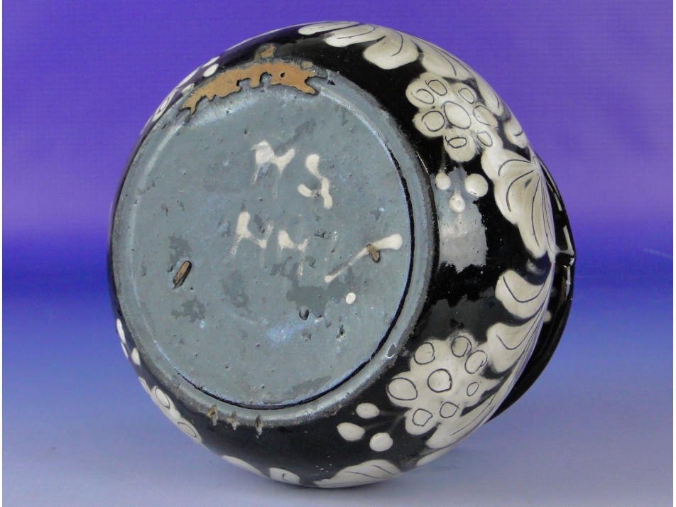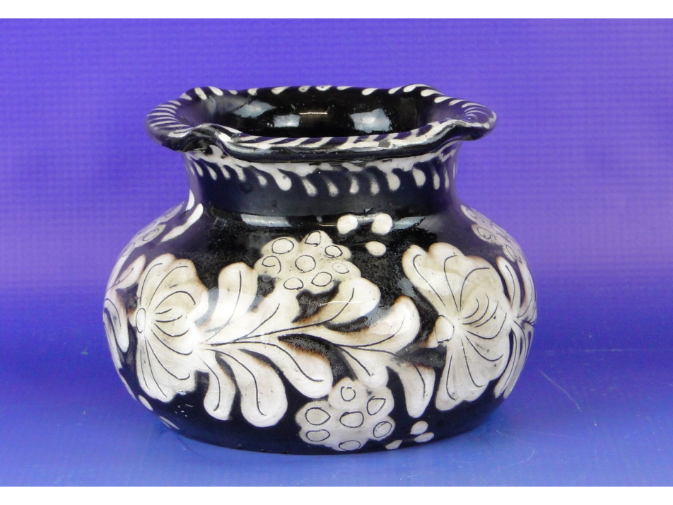 Hibátlan állapotú, kívül belül mázas, jelzett fazekas munka, körben festett virág díszítésekkel. Alján jelzés: MS HMV