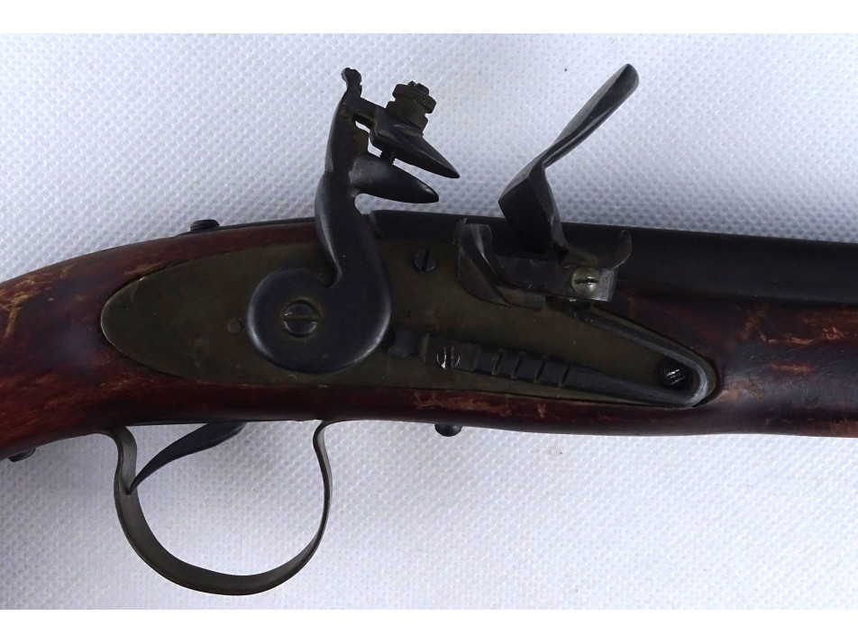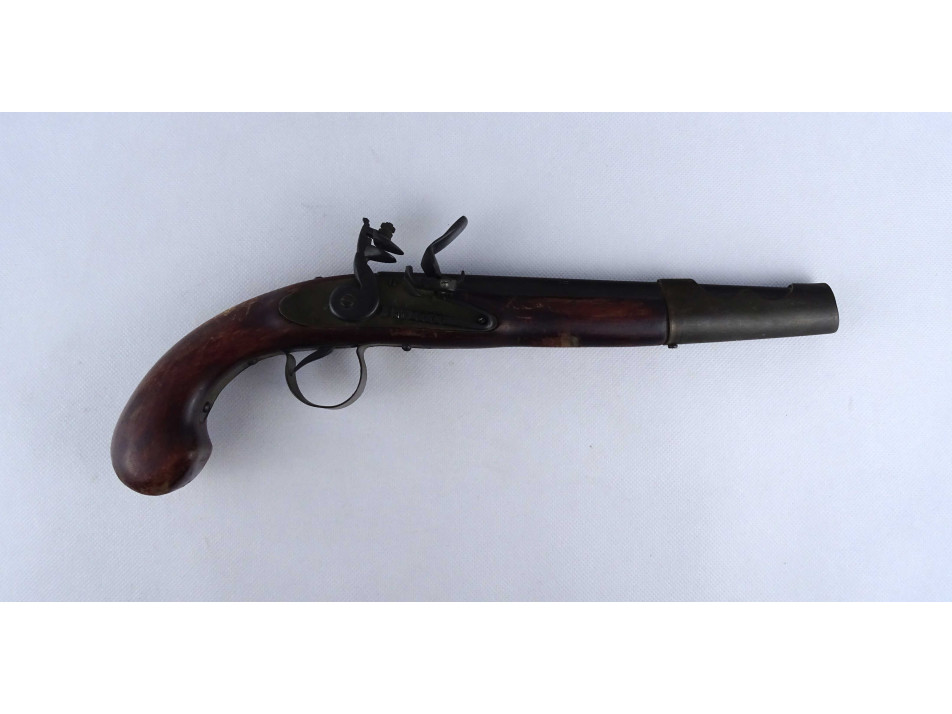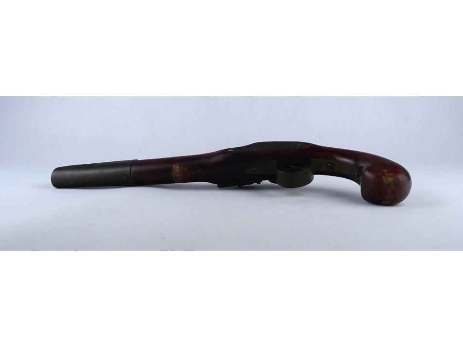 Régi, réz rátétlemezzel díszített, fa ágyazatú elöltöltős kovás pisztoly replika. Nem használható, csak dísz pisztoly. A szerkezet nem működik.