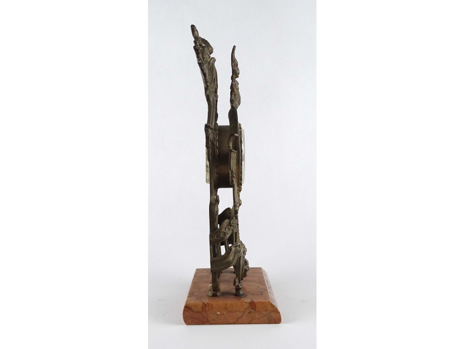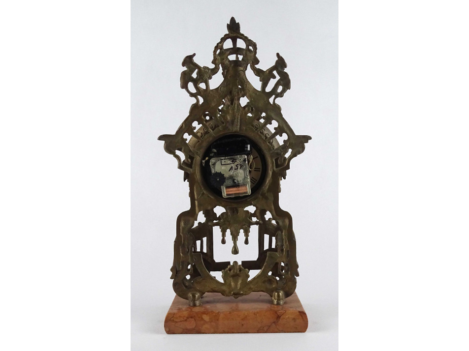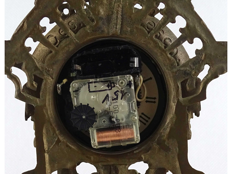 Régi, réz testű asztali óra, kandalló óra márvány talapzaton. Plasztikus barokk motívumokkal gazdagon díszített impozáns darab. Benne modern digitális óraszerkezet található. Az óra jelenleg nem működik, karbantartásra szorul.