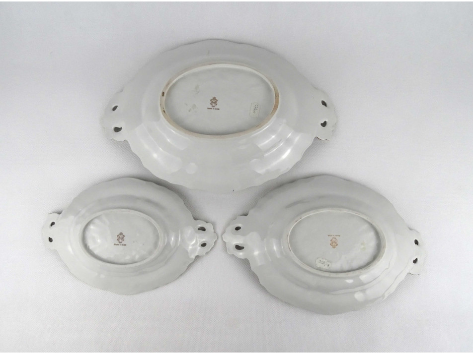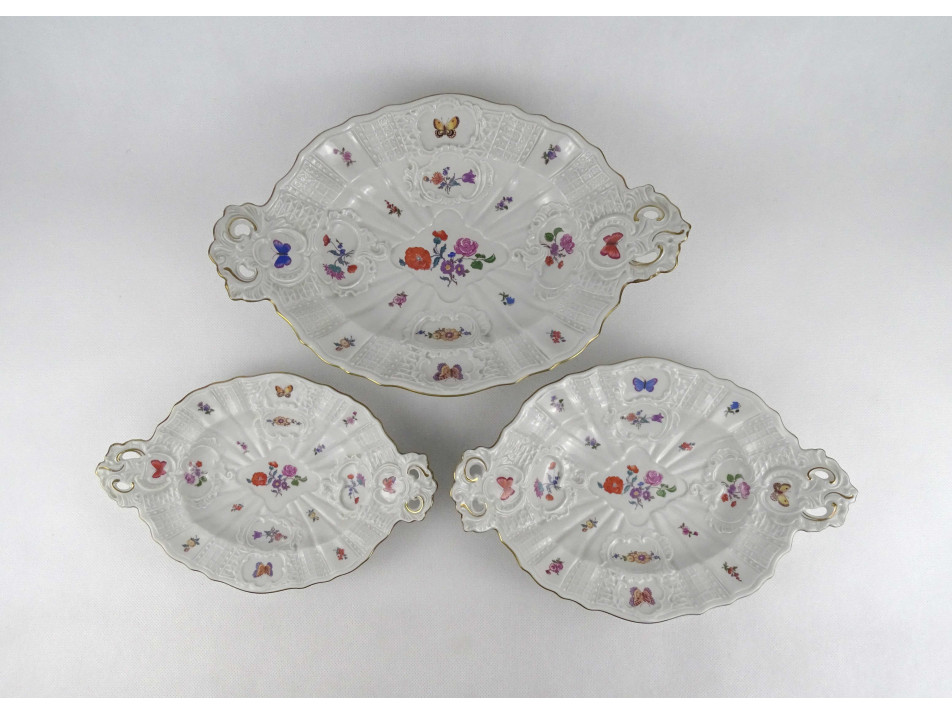 Régi, hibátlan állapotú, ovális alakú, virágokkal és pillangó mintával díszített Volkstedter Rudolstadt porcelán kínáló tál készlet, 3 darab különböző méretben.