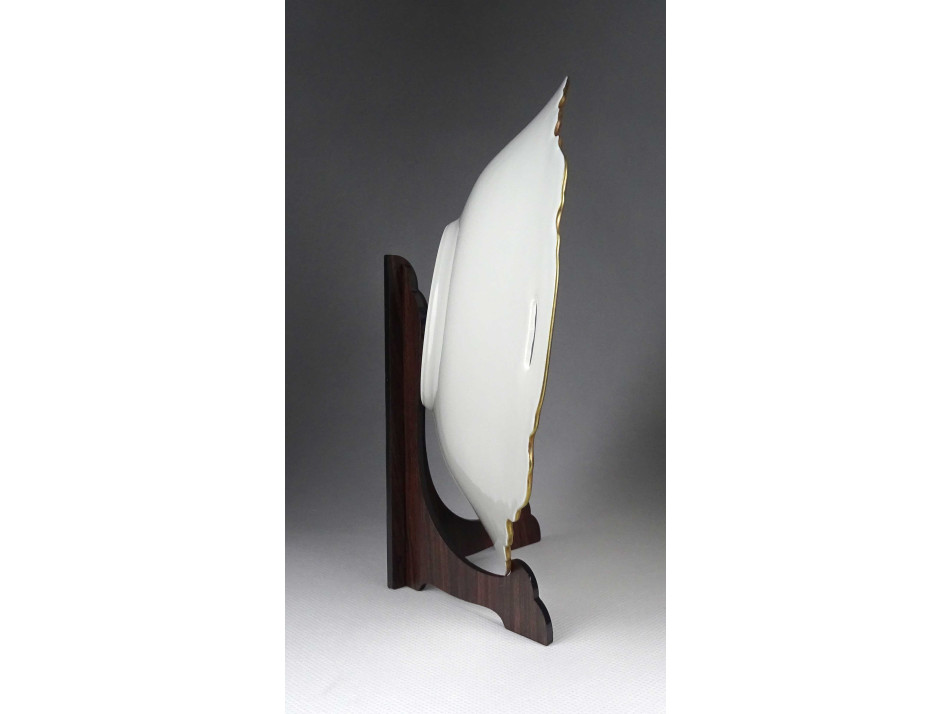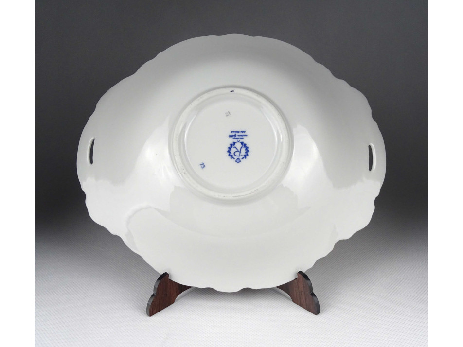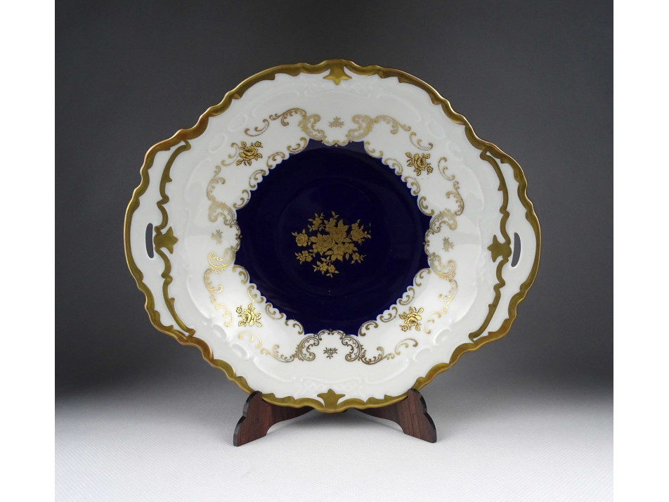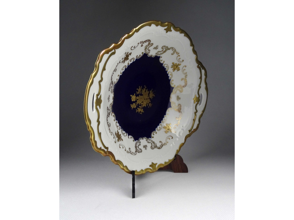 Hibátlan állapotú, jelzett, vastagon aranyozott peremű, közepén kobaltkék színű porcelán asztalközép kínáló tál, nassos tál.