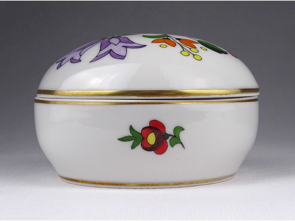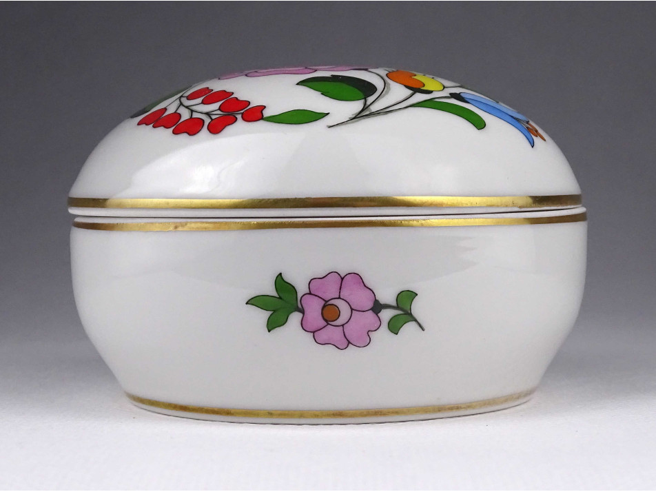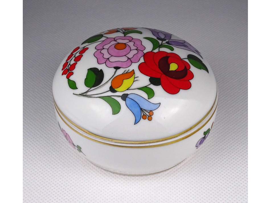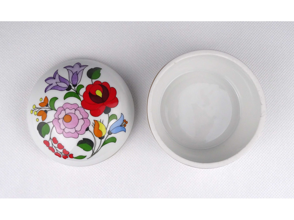 Hibátlan állapotú, szélén, körben aranyozott, tipikus kalocsai virágmotívumokkal gazdagon díszített porcelán bonbonier, gyűrűtartó, ékszertó.