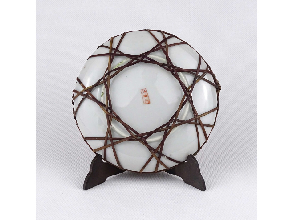 Régi japán Satsuma, kézzel festett, két alakos porcelán tányér, nádfonat keretben 13.4 cm