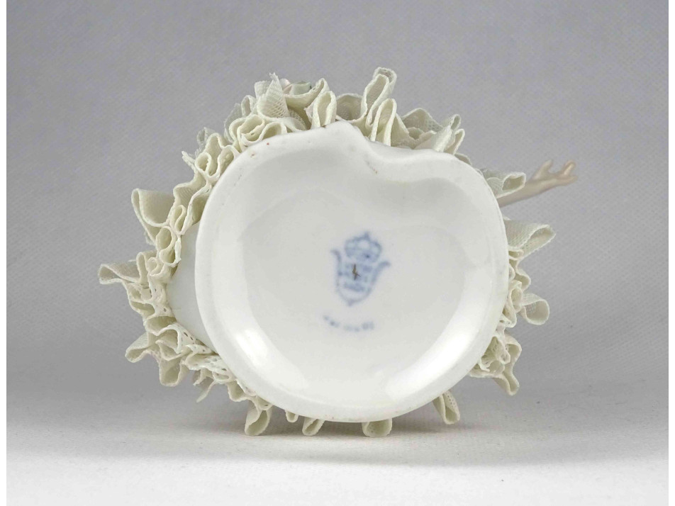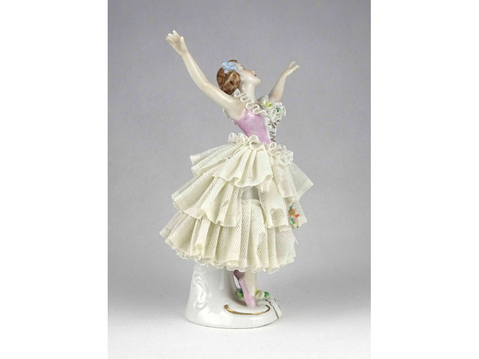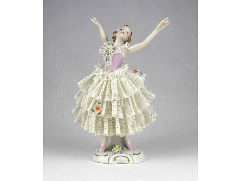 Régi, jelzett, Unterweissbach tüllszoknyás balerina porcelán figura. A szoknyán több hiba található, jobb kezének mutatóujja sérült.