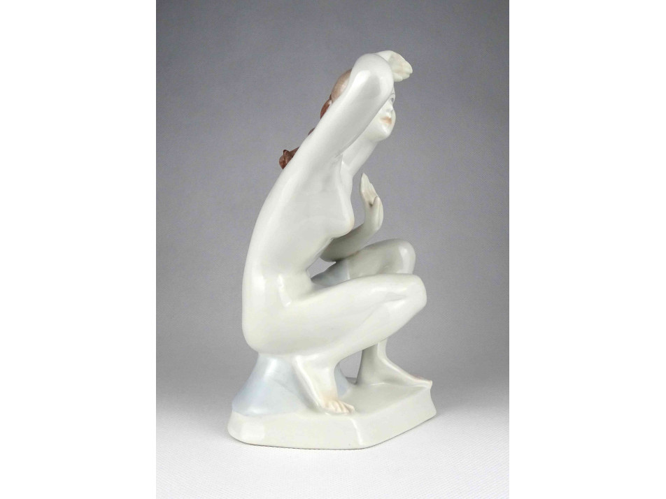 Hibátlan állapotú Aquincum porcelán térdelő női akt szobor, kézi festéssel díszítve.