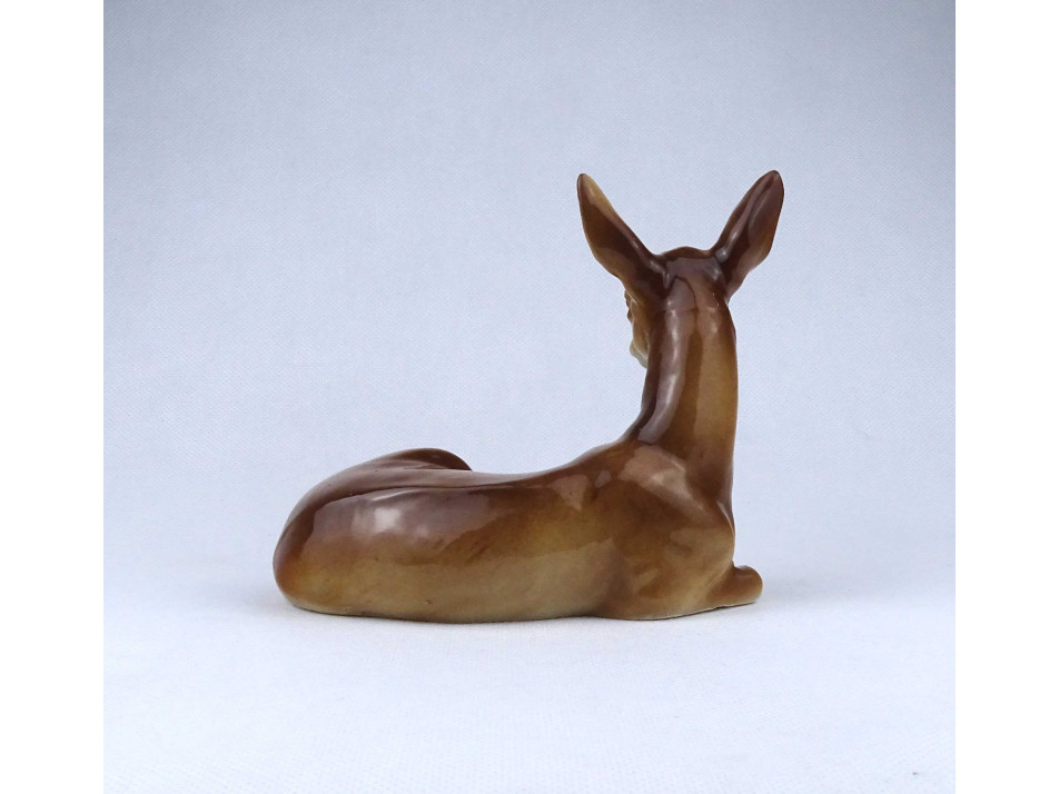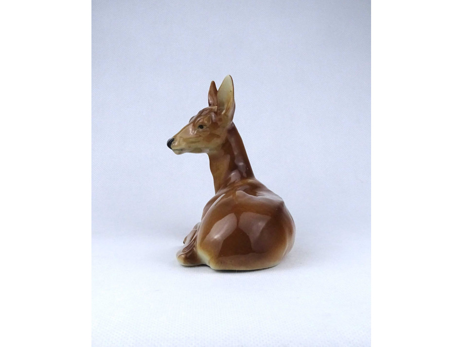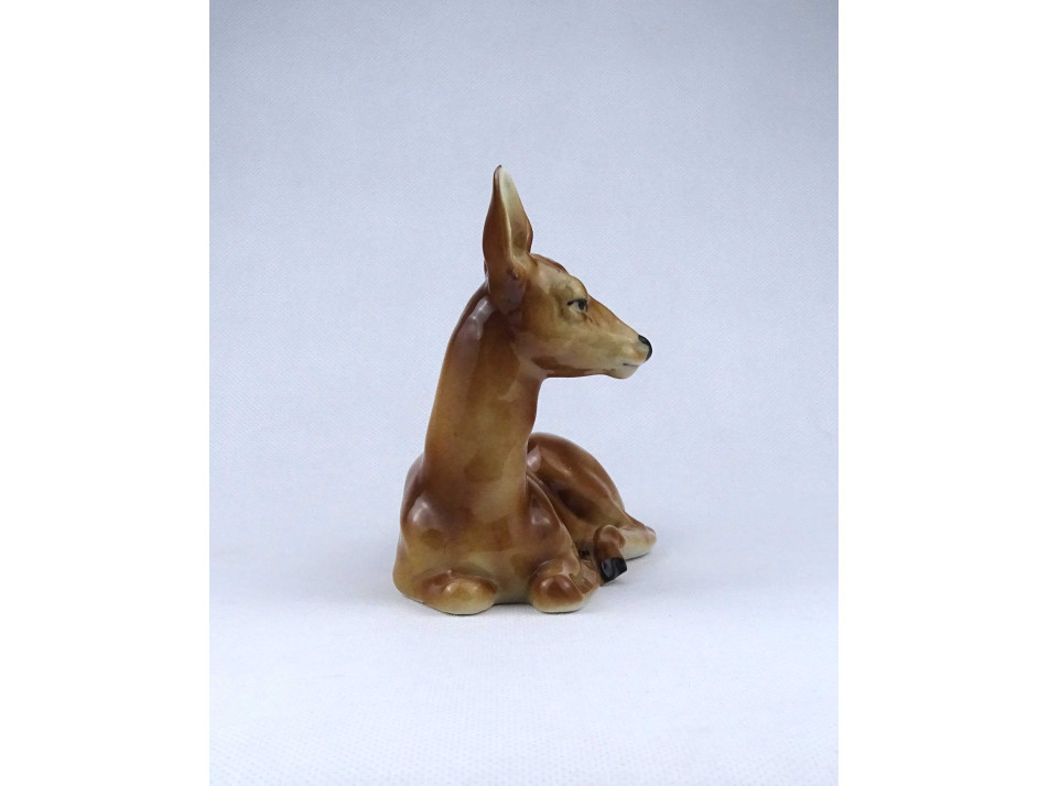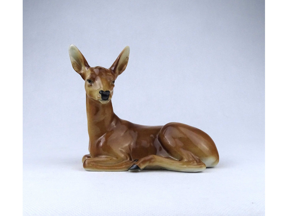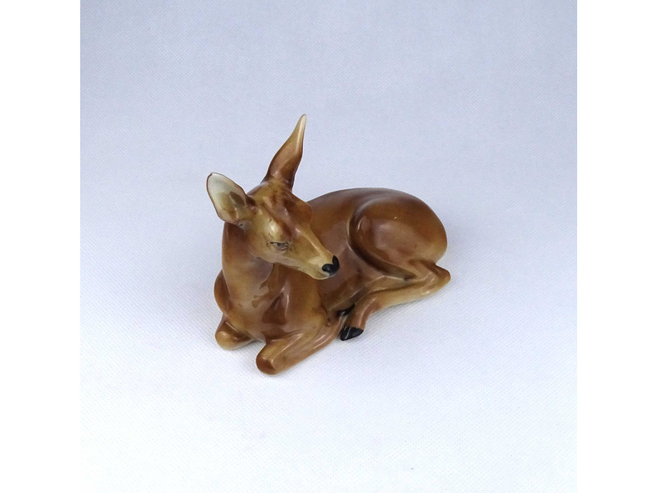 Régi, szép állapotú, jelzetlen német porcelán őz figura. Kézi festéssel díszített nagyméretű fekvő őzike.