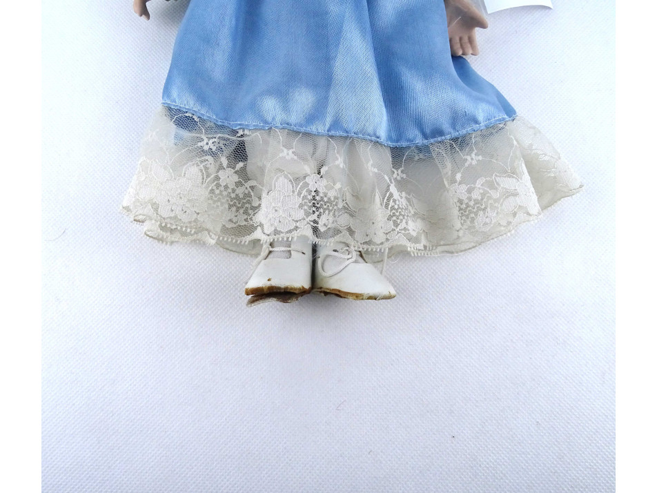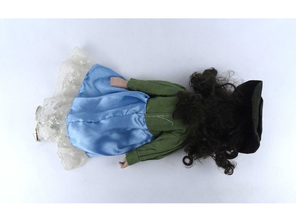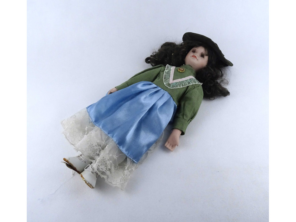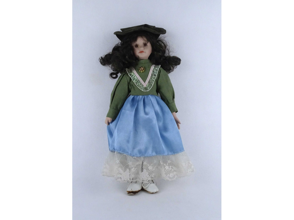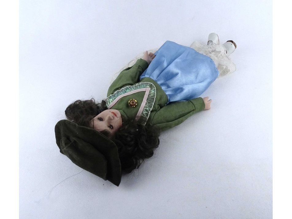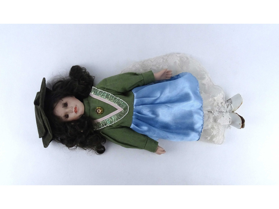 Teljes öltözékben, elegánsan felöltöztetett porcelán baba. Feje, mellkasa, kézfejei és lábai porcelánból készültek. A teste textil.