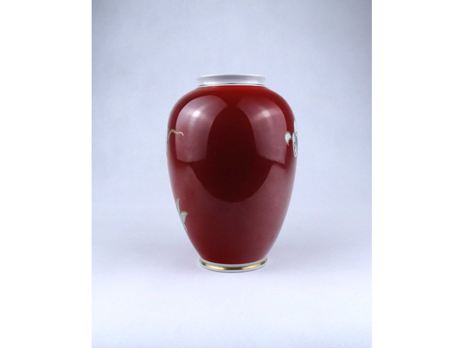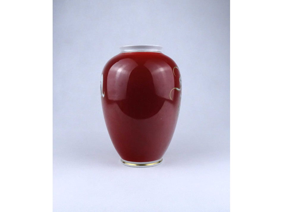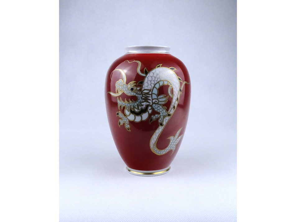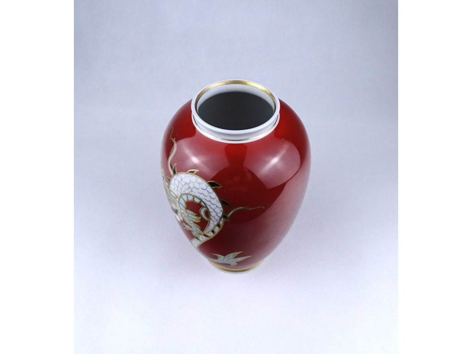 Régi, gazdagon aranyozott, vörös színű, sárkány díszes, jelzett Wallendorf porcelán váza, díszváza. Felső pereme restaurátor által szakszerűen javított.