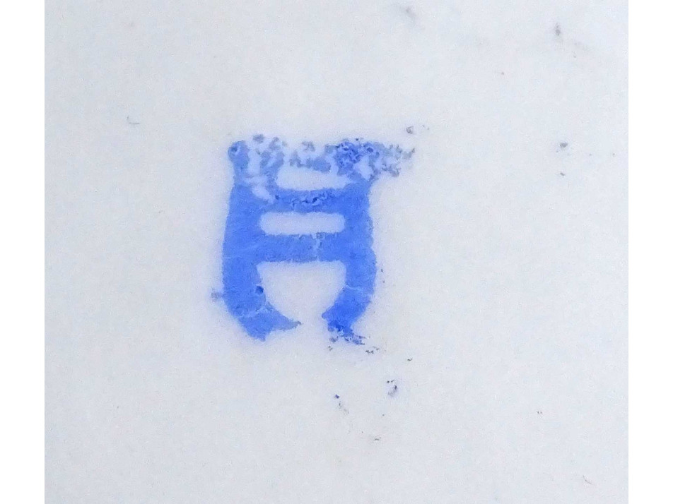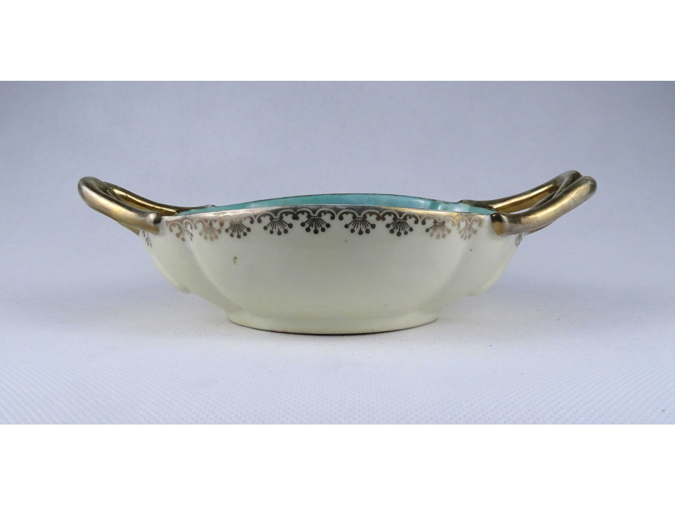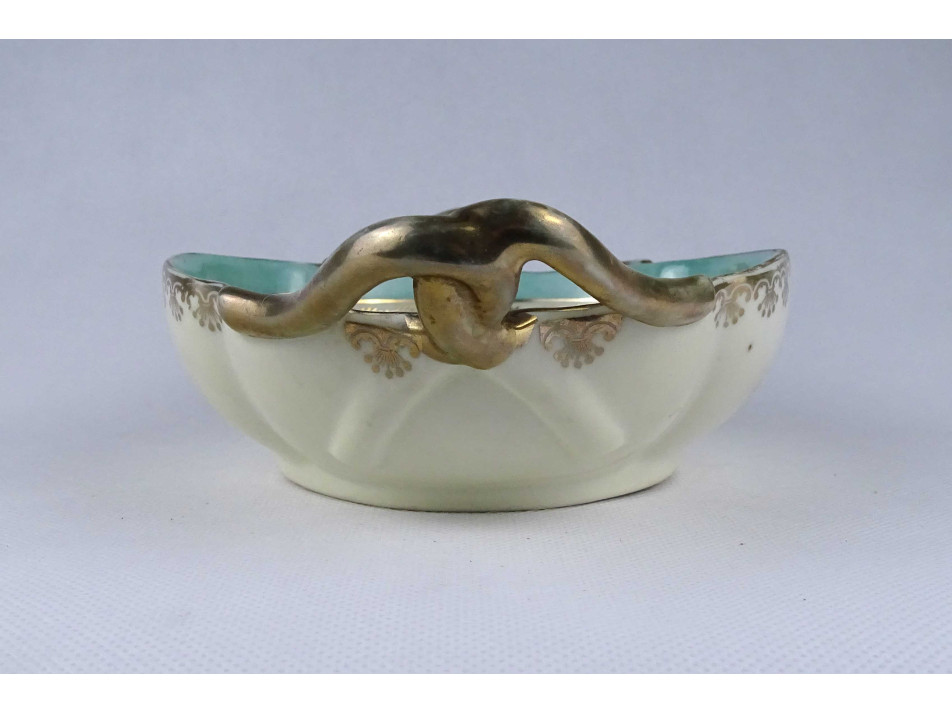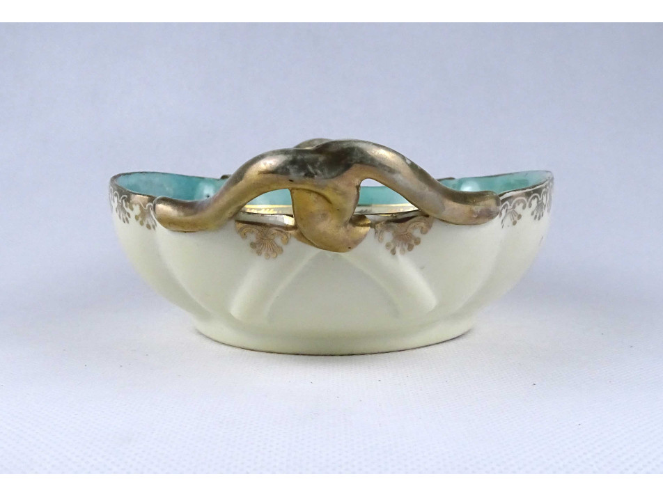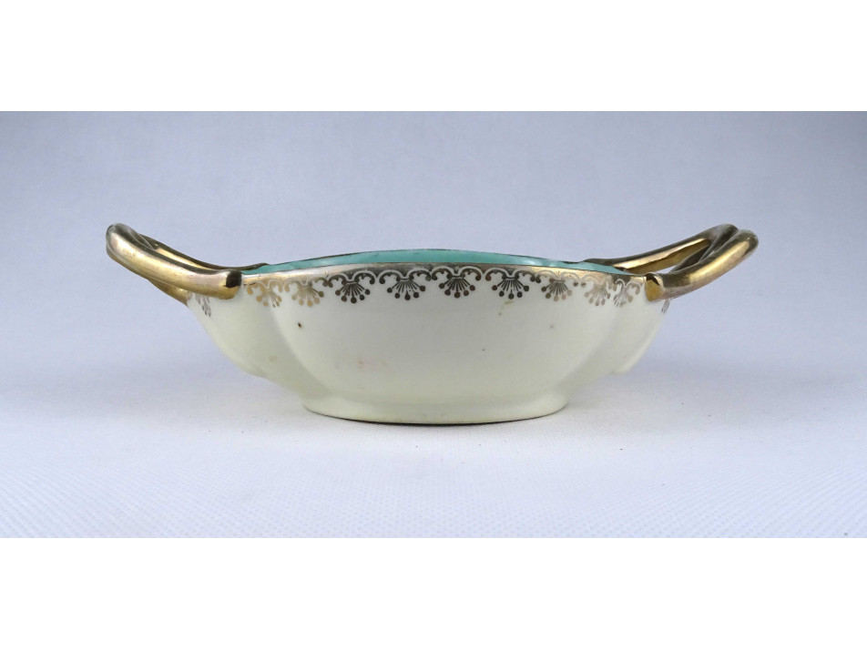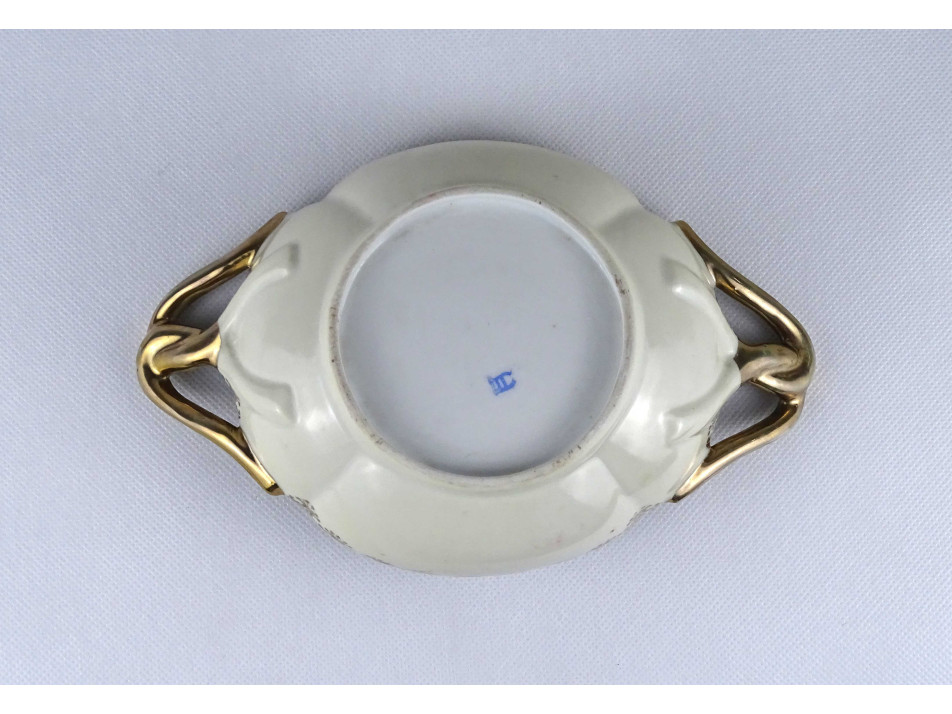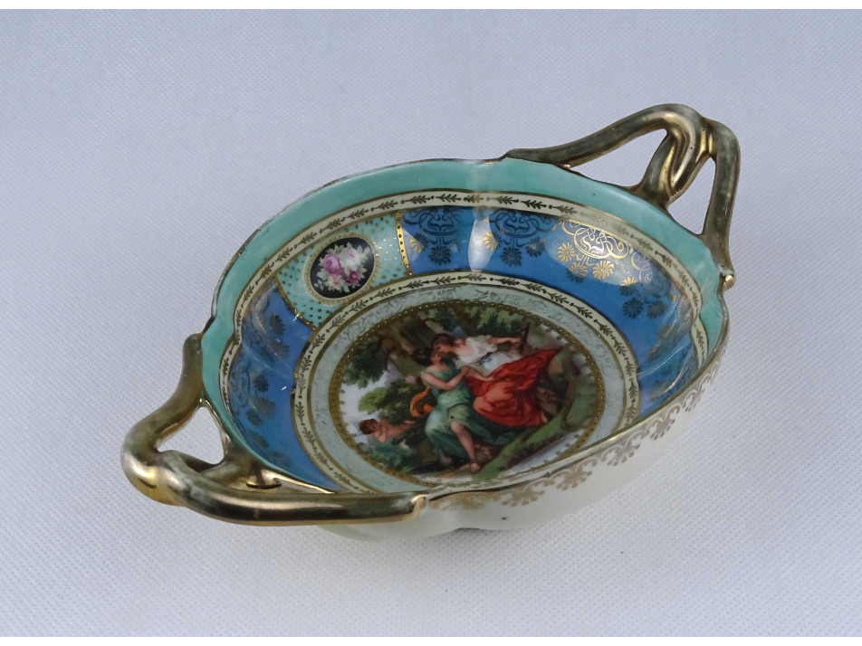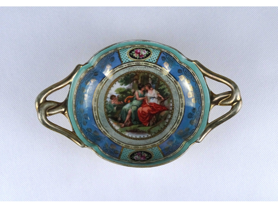 Régi, szép állapotú, fonott fülű, gazdagon aranyozott Altwien porcelán asztalközép kínáló tál. Közepén allegorikus jelenet látható. A tál felső pereme restaurátor által szakszerűen javított. Aranyozása kopottas.