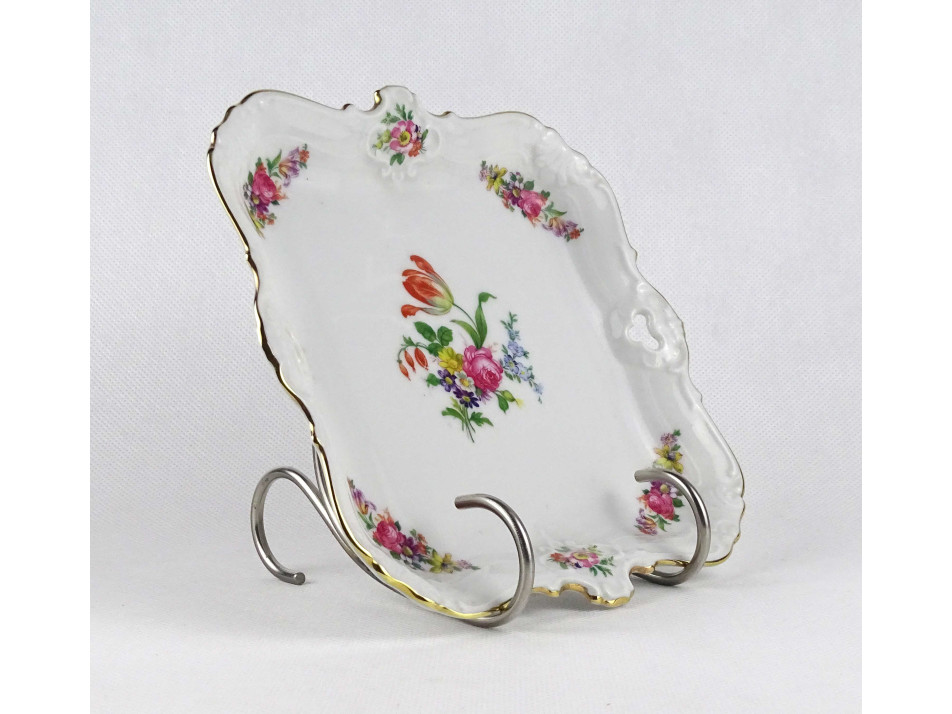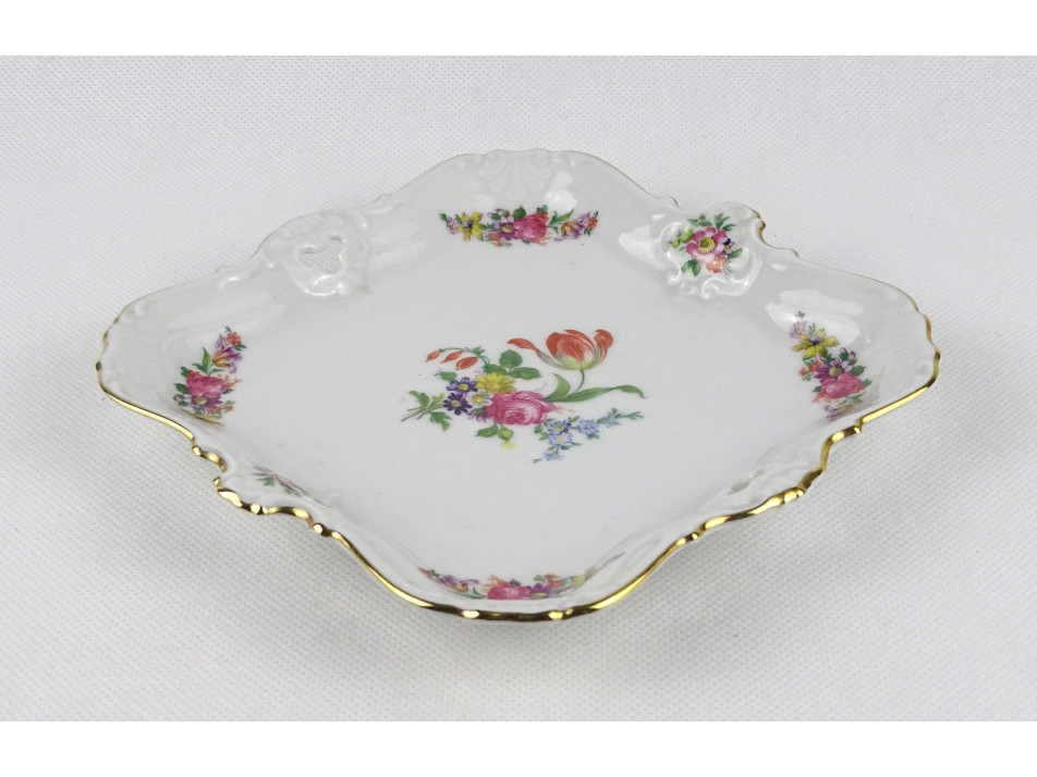 Hibátlan állapotú, jelzett, négyzet alakú, virágmintás, aranyozott szélű Seltmann Weiden porcelán kínáló tál, kis tál.