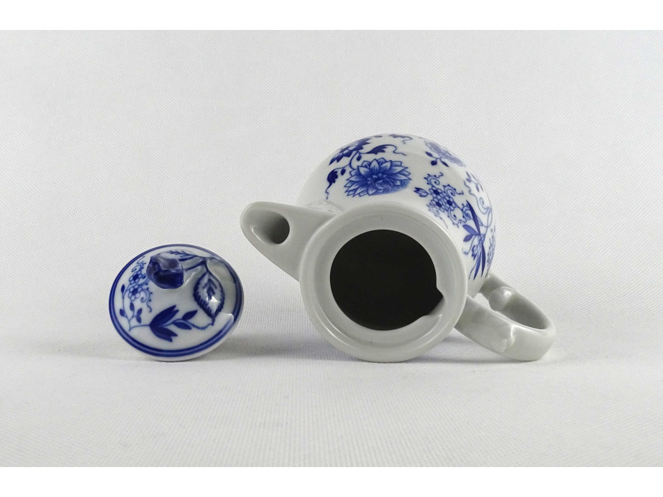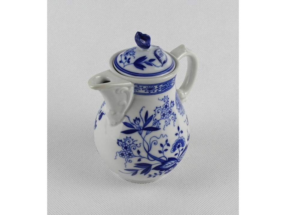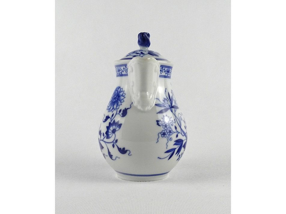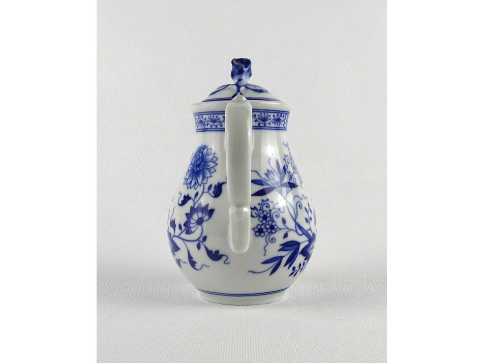 Régi, szép állapotú, jelzett, gyönyörű kék-fehér virágmintákkal díszített, kisméretű német Hutschenreuther Selb porcelán fedeles kávés vagy teás kanna, esetleg tejszínes kiöntő. A fedél fogójául szolgáló porcelán rózsa letört, ragasztott. Funkciójában nem sérült.