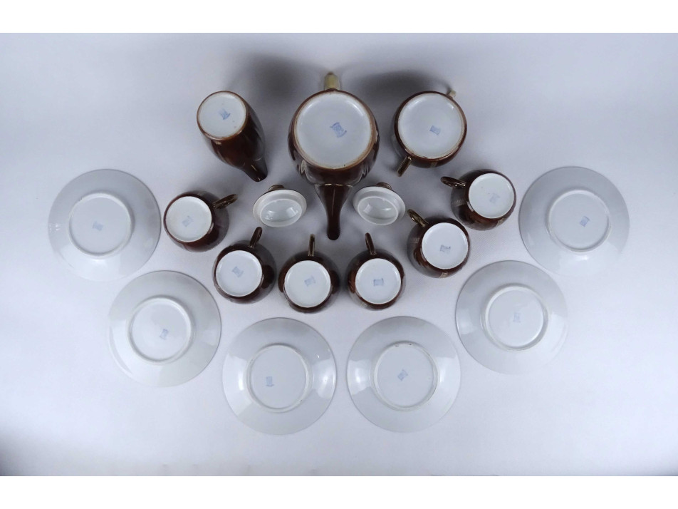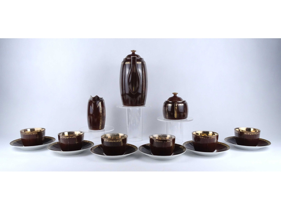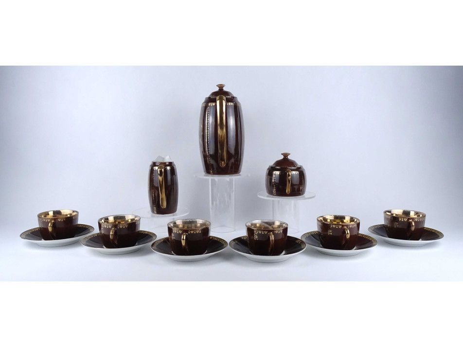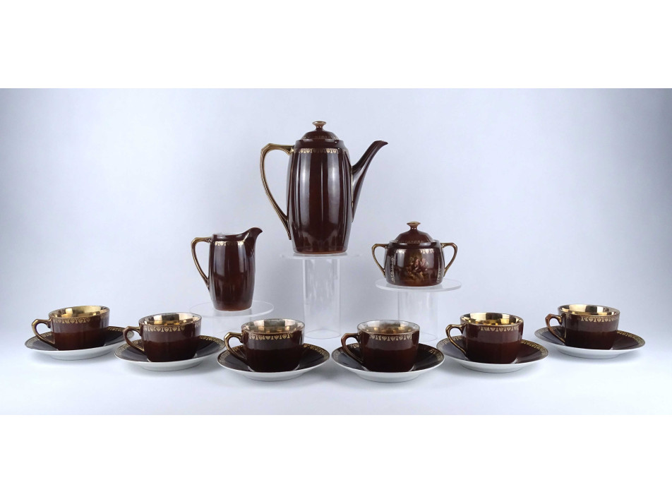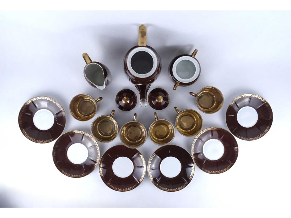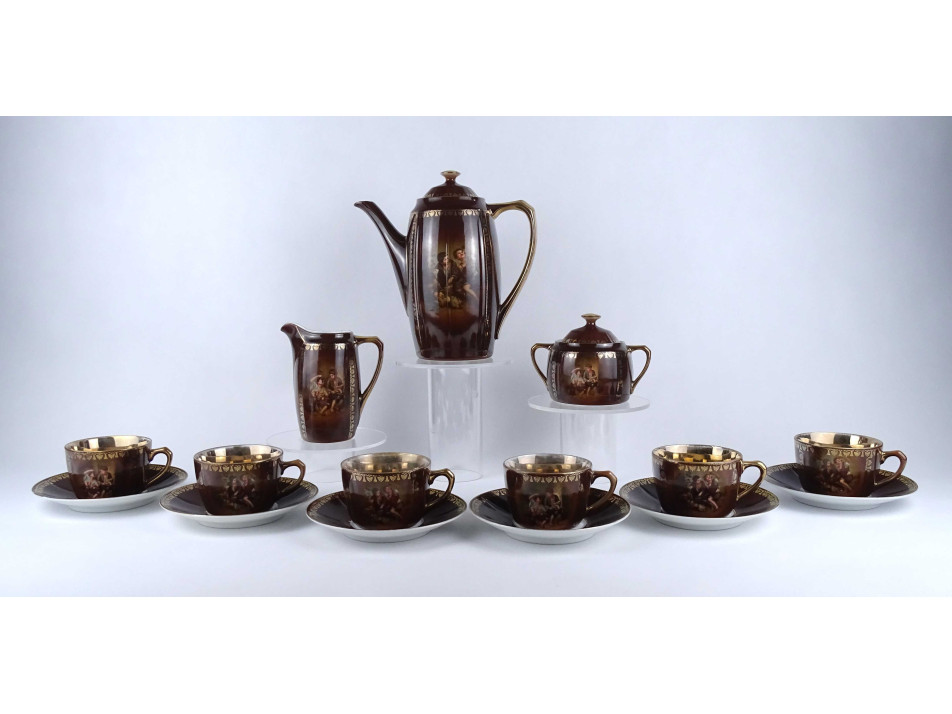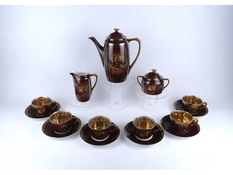 Régi, hibátlan állapotú, hat személyes, barna színű, gazdagon aranyozott, jelenetes Bavaria Schumann porcelán teás készlet, 15 darab. Az egyik csésze pereme restaurátor által szakszerűen javított.
