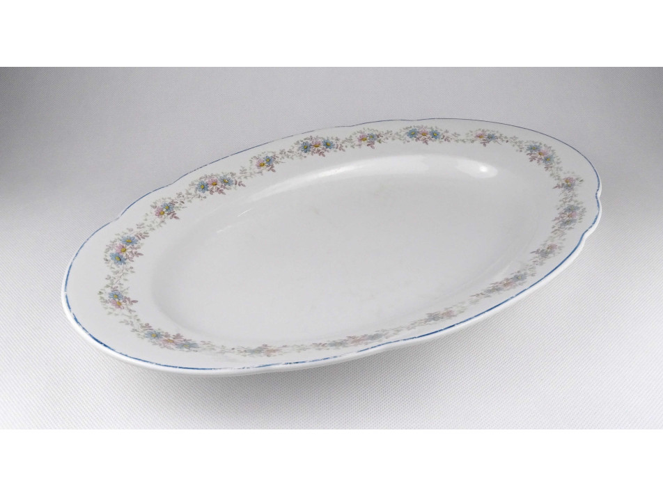 Régi, kék virágmintás, ovális Fischer & Mieg Pirkenhammer porcelán pecsenyéstál