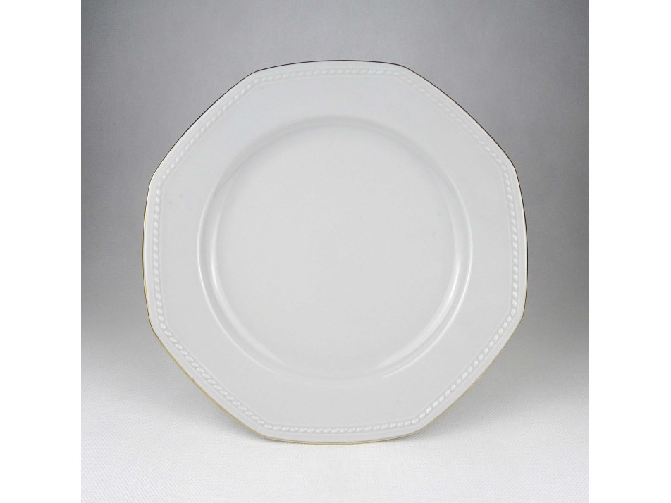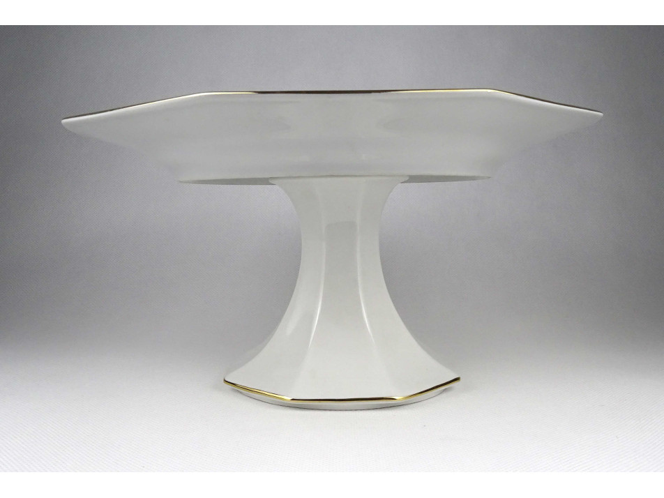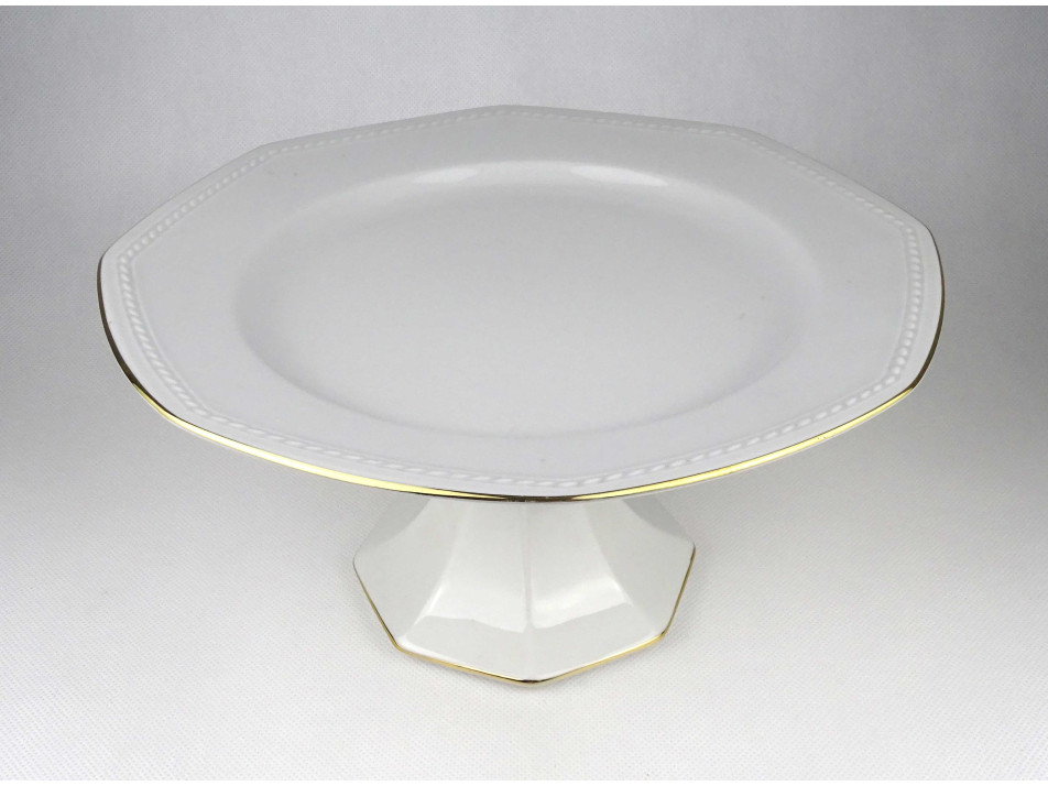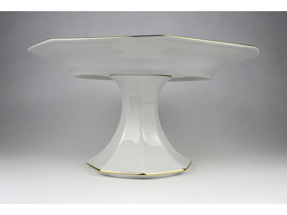 Régi, hibátlan állapotú, festetlen, arany szegélyes, jelzetlen porcelán talpas tortatál, torta kínáló.