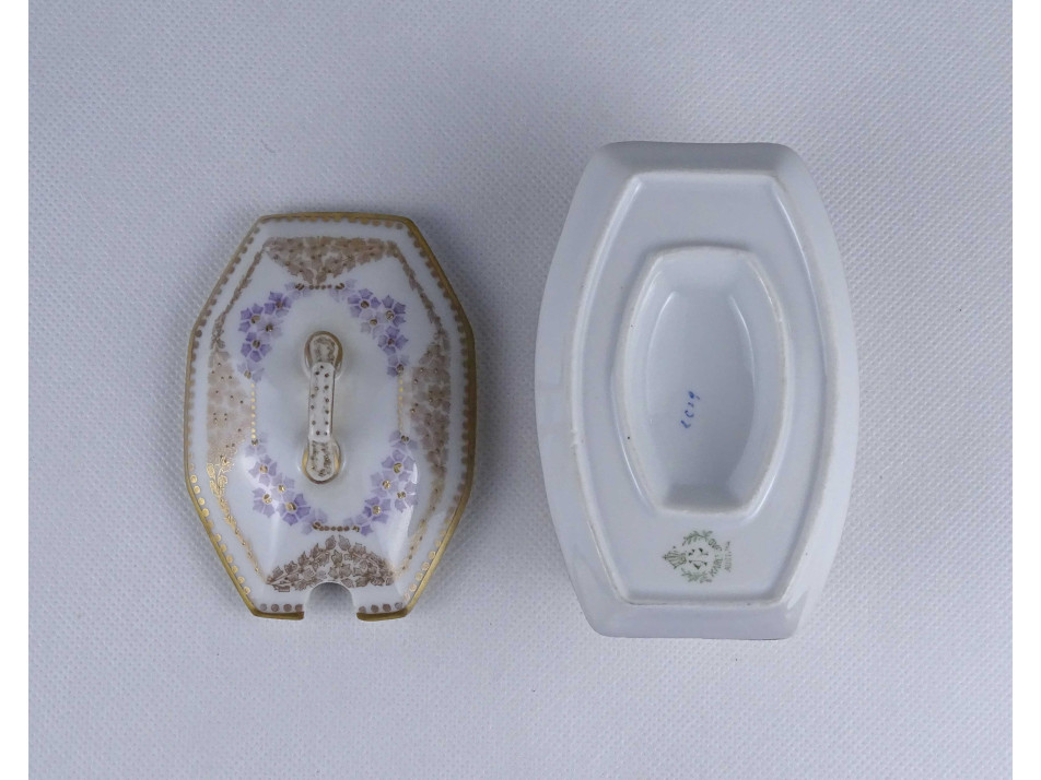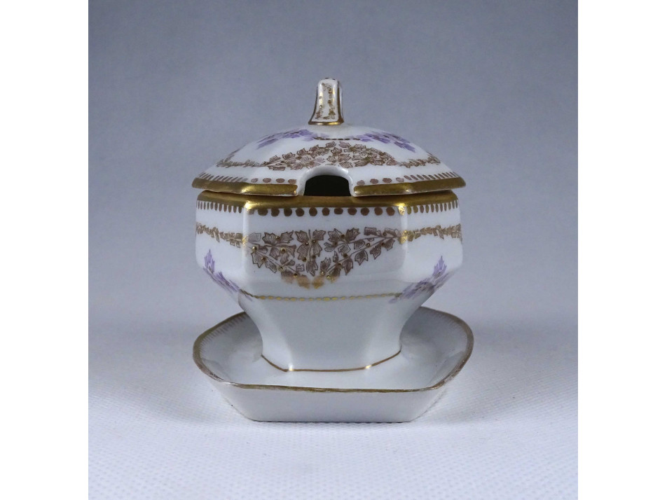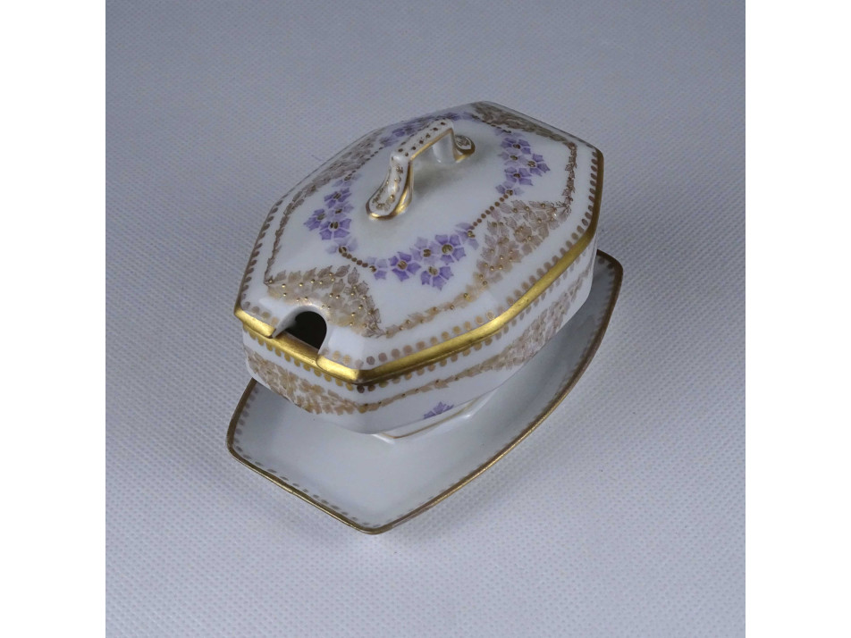 Régi, szép állapotú, gazdagon aranyozott apró virágmintás porcelán szószos tál fedővel. Aljának pereme restaurátor által szakszerűen javított.