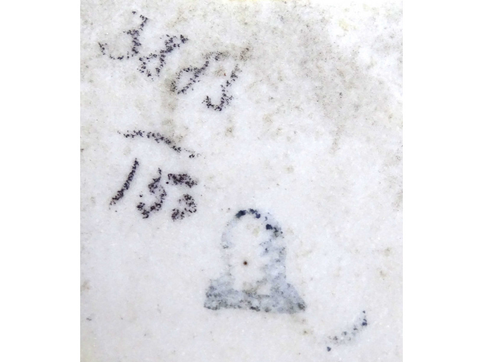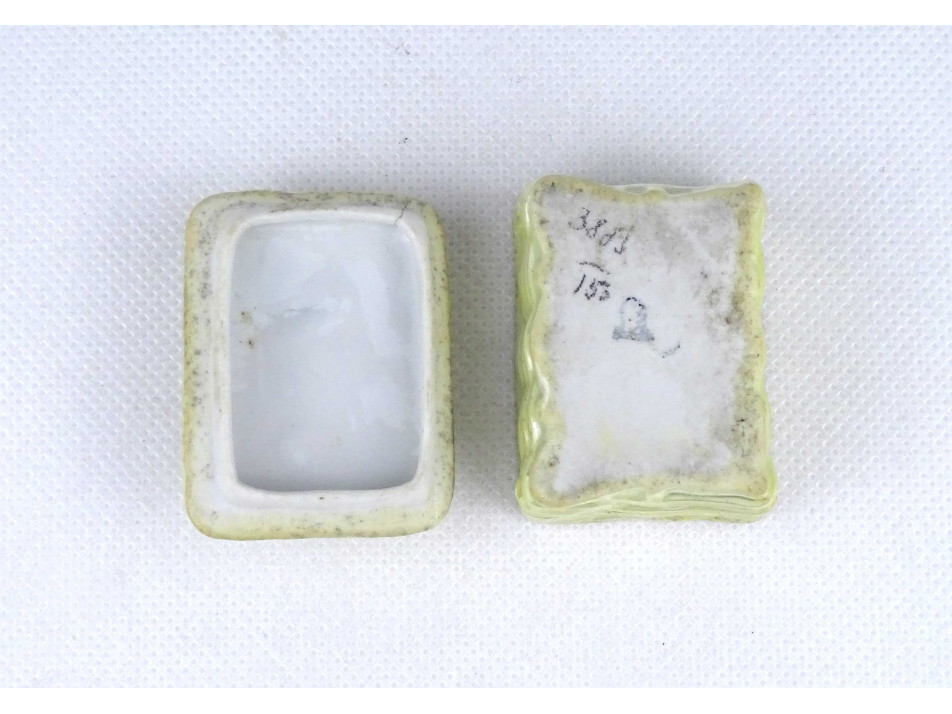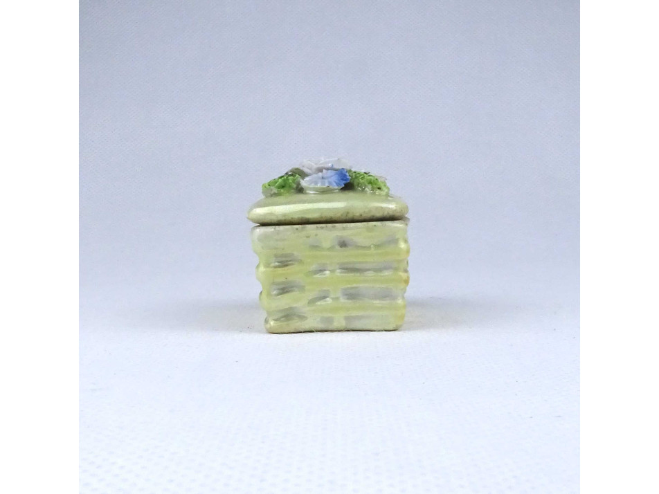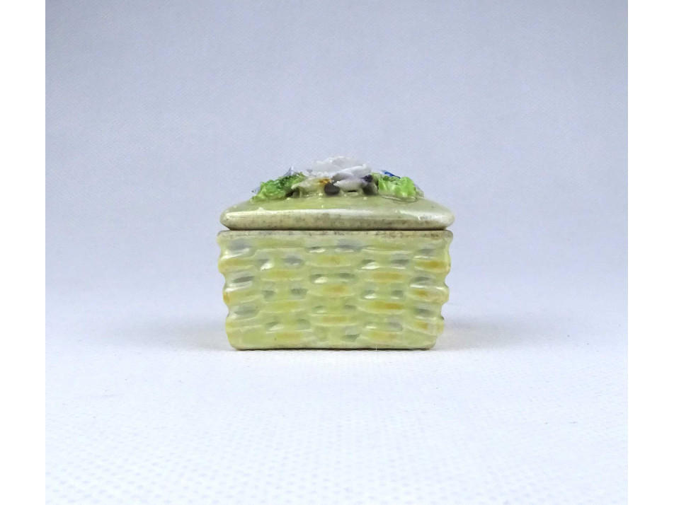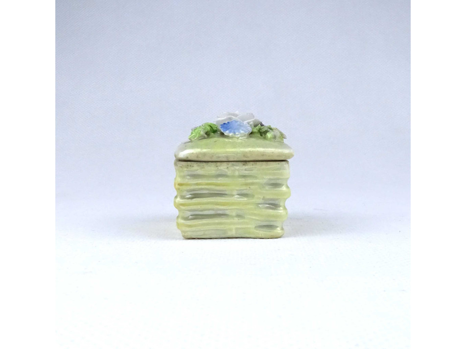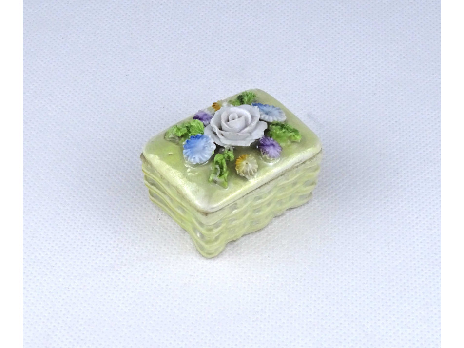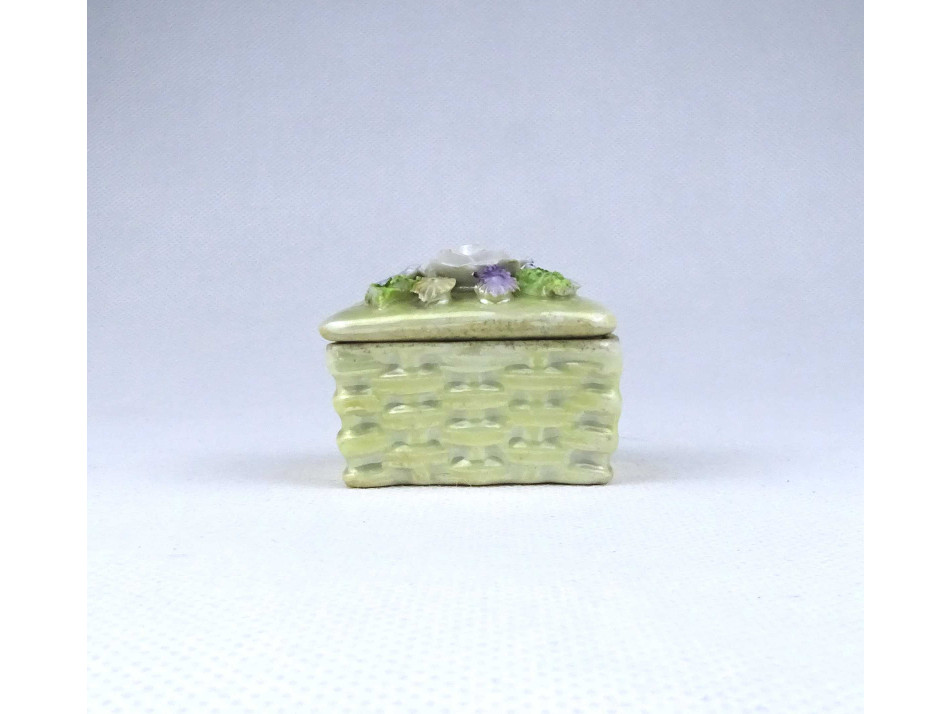 Régi, kisméretű, halványzöld színű, irizáló, mázas, tetején apró plasztikus virágokkal díszített, kosárfonatot imitáló oldalú, jelzett porcelán bonbonier.