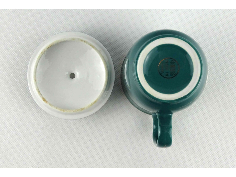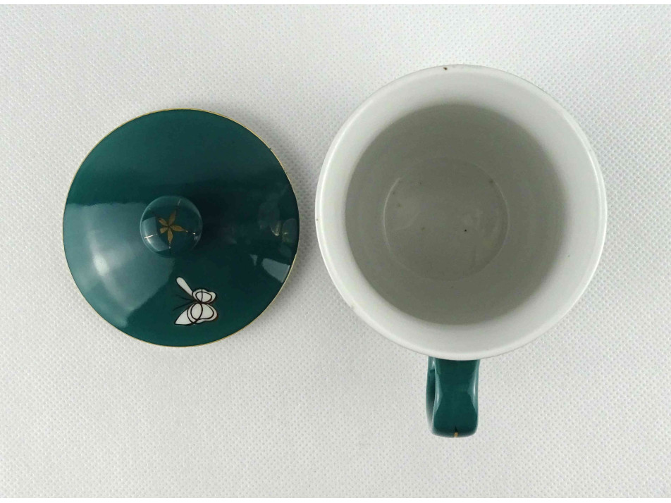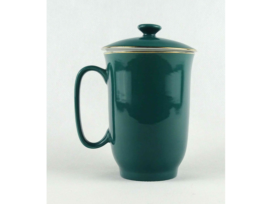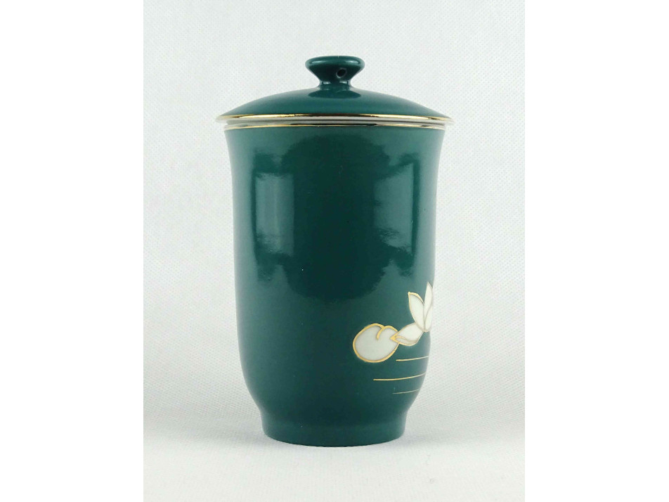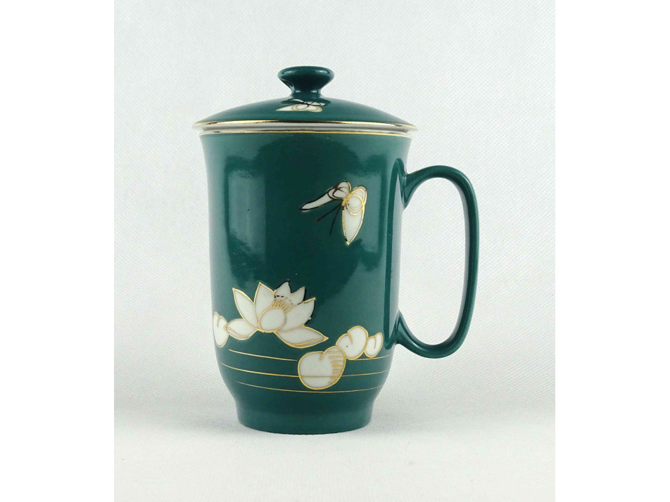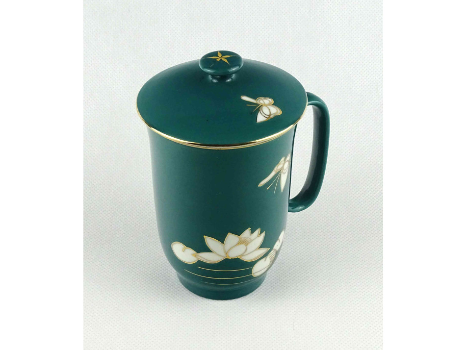 Hibátlan állapotú, zöld színű kínai porcelán teáscsésze, teásbögre fedéllel. Oldalán aranyozással készített pillangó és virágminta.