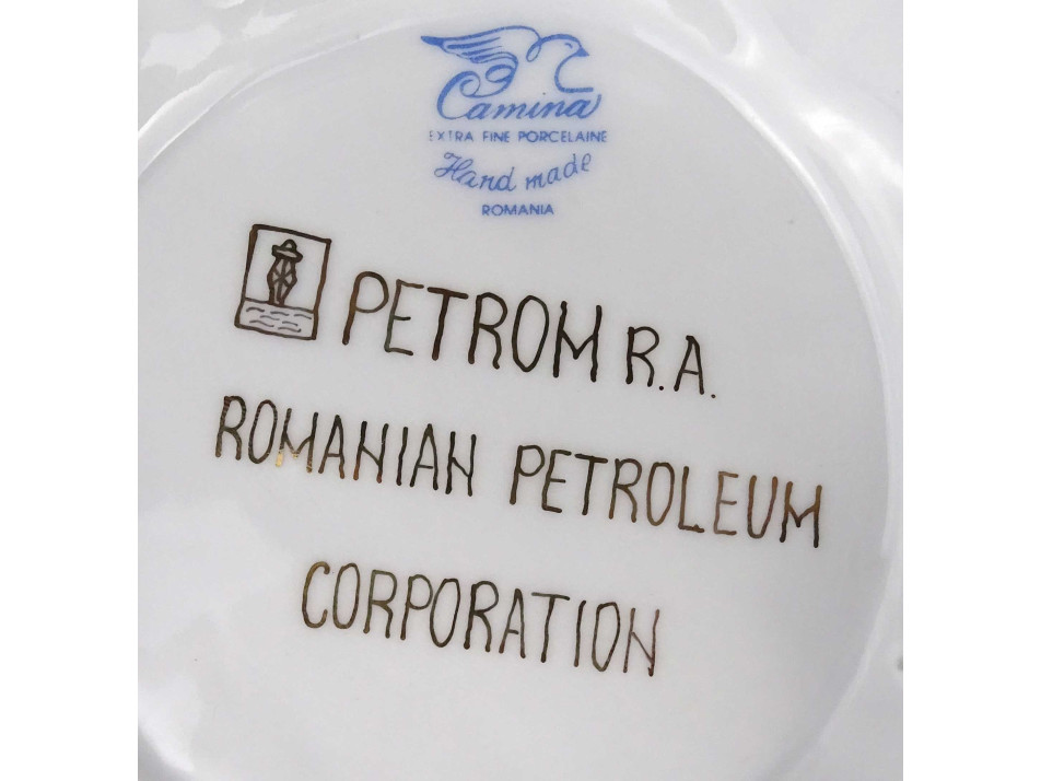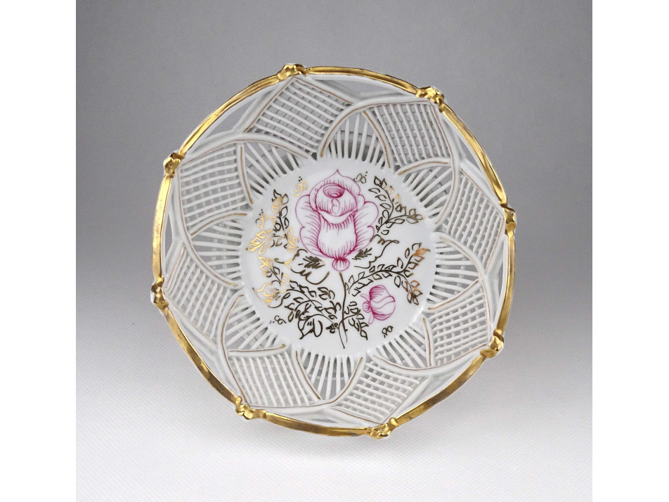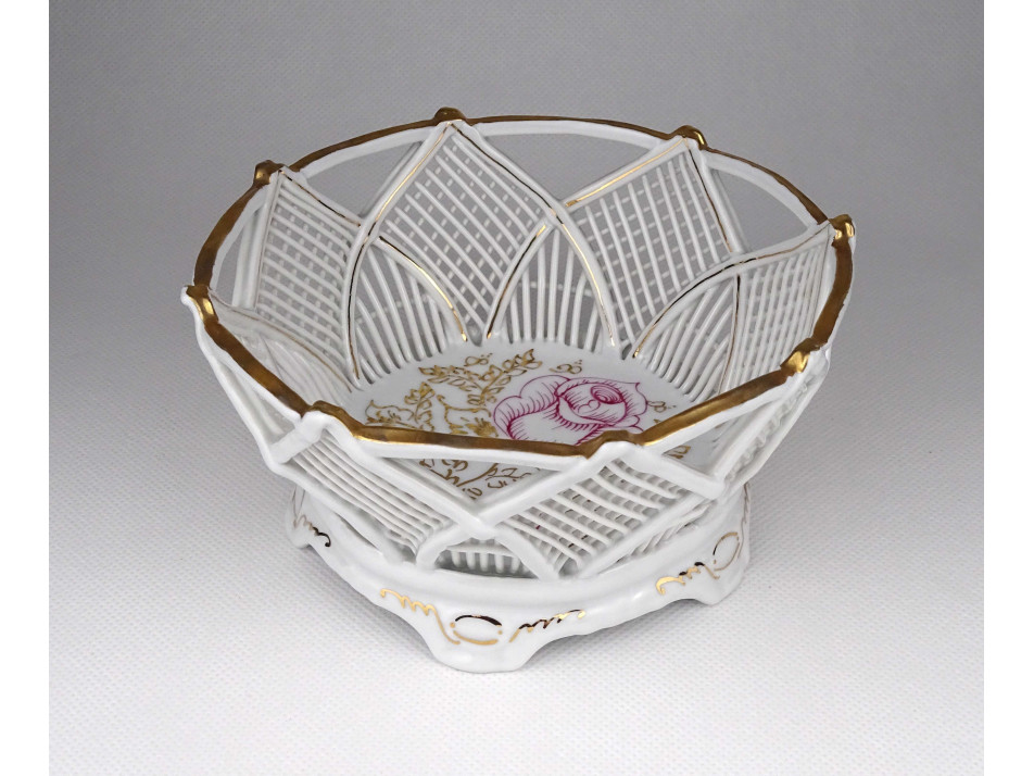 Régi, hibátlan állapotú, áttört, fonott szélű, aranyozott, rózsa mintás Camina porcelán kosár.
