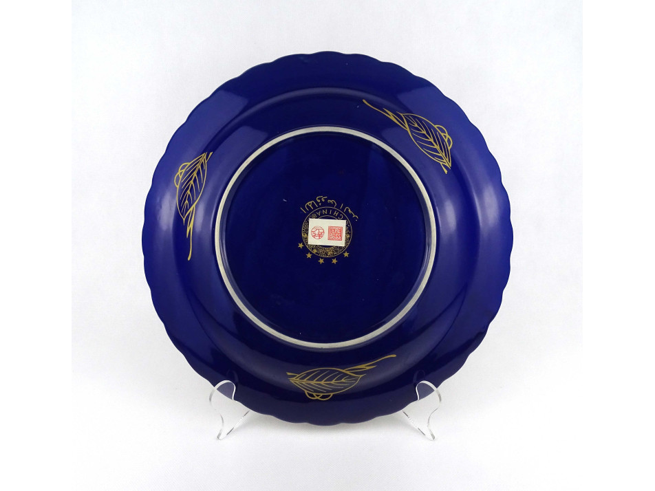 Nagyméretű kobaltkék aranyozott páva mintás kínai porcelán dísztál 37.5 cm