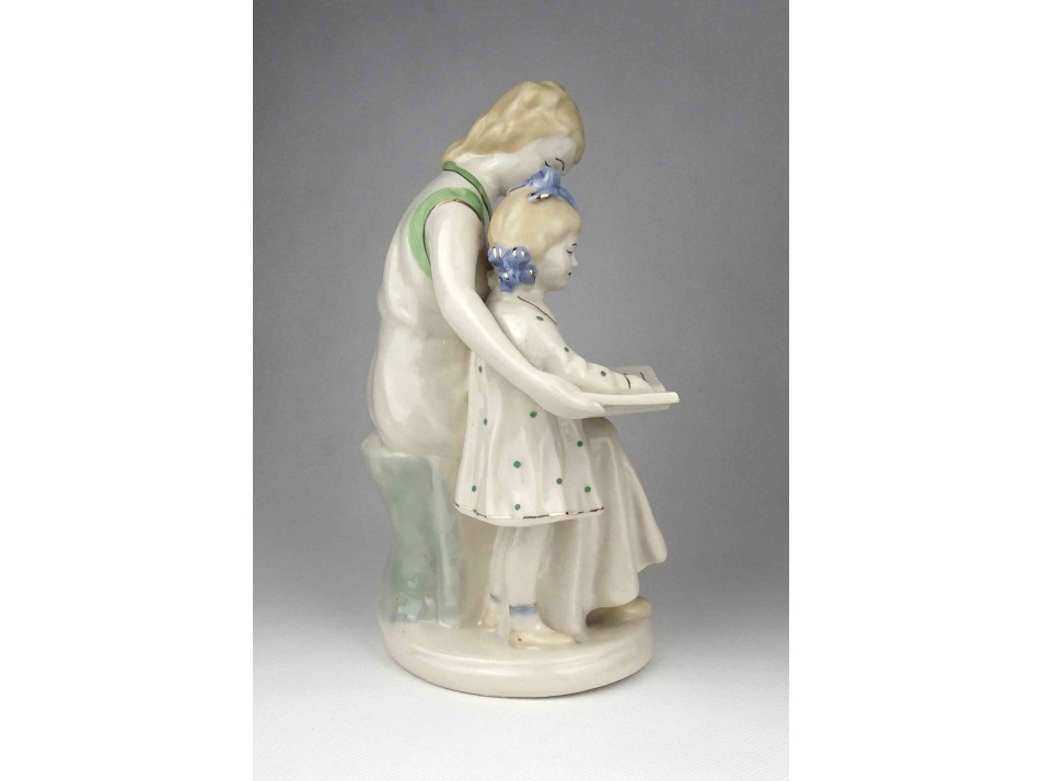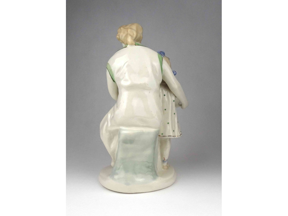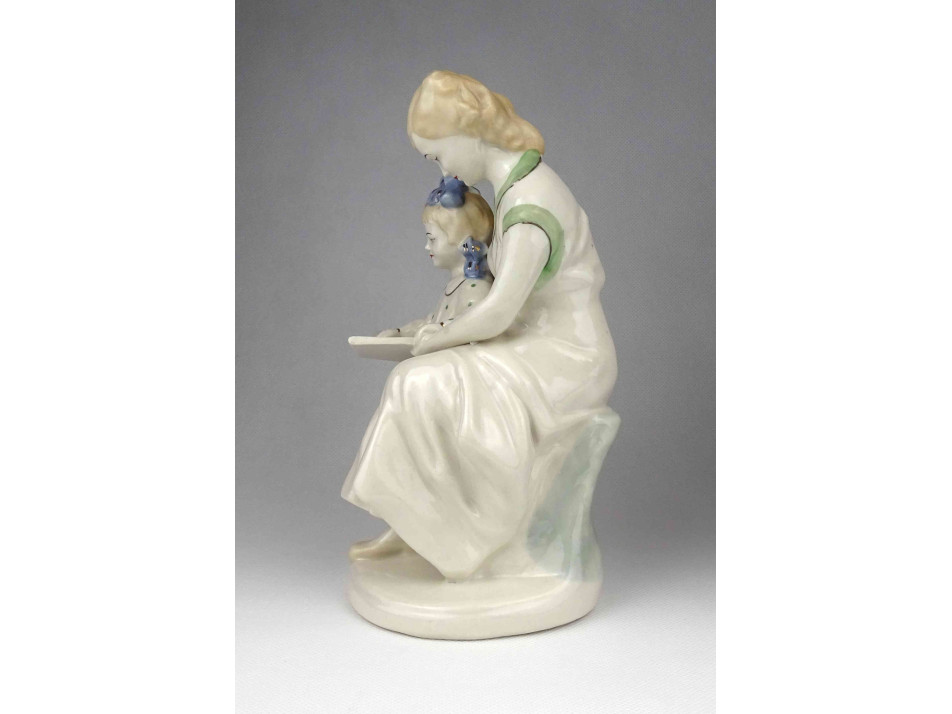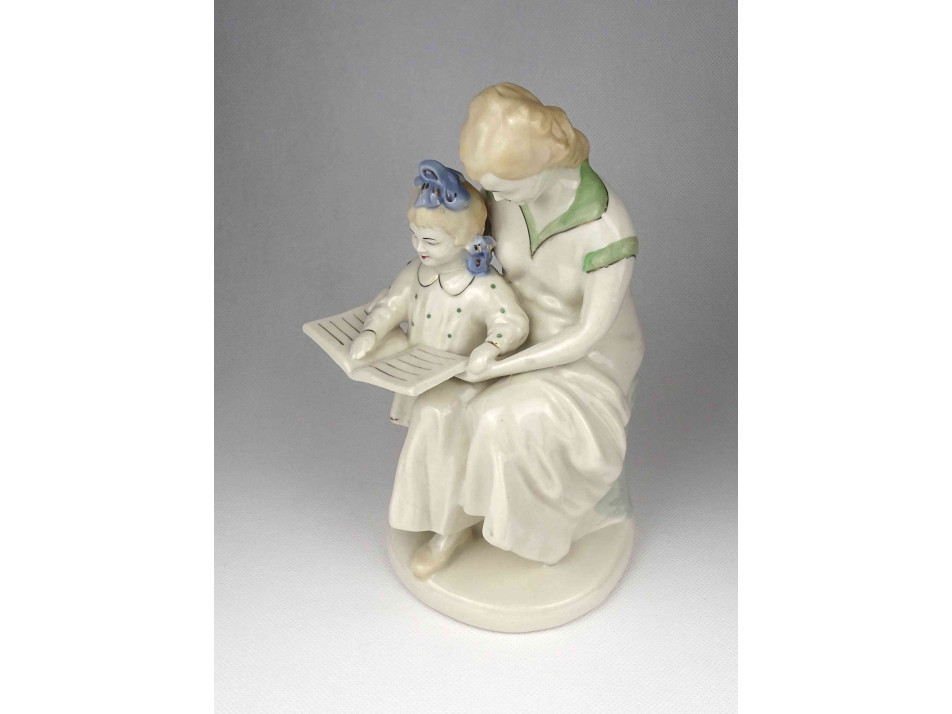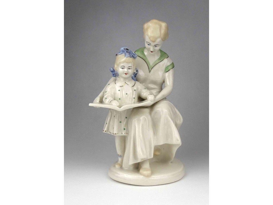Hibátlan állapotú, nagy méretű, jelzett, kézzel festett orosz Polonne kétalakos porcelán figura, kislányával együtt olvasó édesanya porcelán szobor.