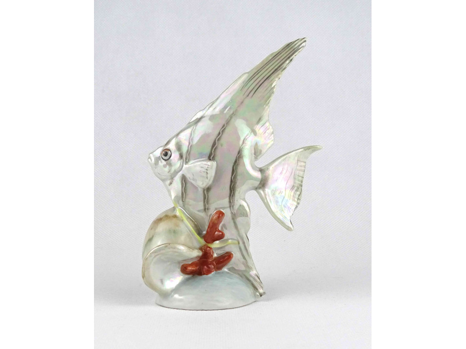 Régi, hibátlan állapotú, irizáló mázas Kőbányai porcelán tengeri hal szobor, vitorlás hal figura, tengeri csigával.